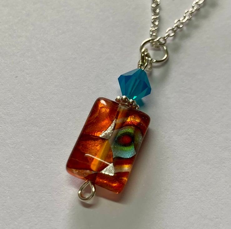 Beautiful Lamp work glass bead with a stunning Swarovski Crystal. The main colour of the lamp work bead is a delicate Orange with hints of Blue running through. Taking the Blue from the bead I have added a Swarovski crystal to pull out the Blue. The pendant will come on a 20" Silver Plated chain with a lobster clasp fastener.
