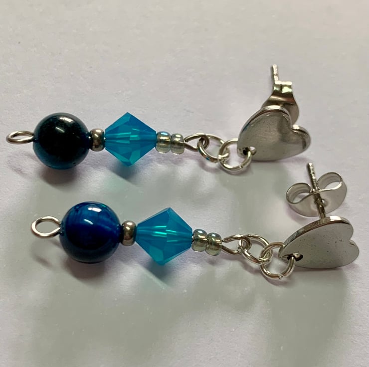 Gorgeous earrings made using Blue Tiger Eye Stone with a pale blue shimmer running through, and a Swarovski Crystal that matches the shimmer beautifully. These dainty dangle earrings hang from a Stainless Steel heart stud.