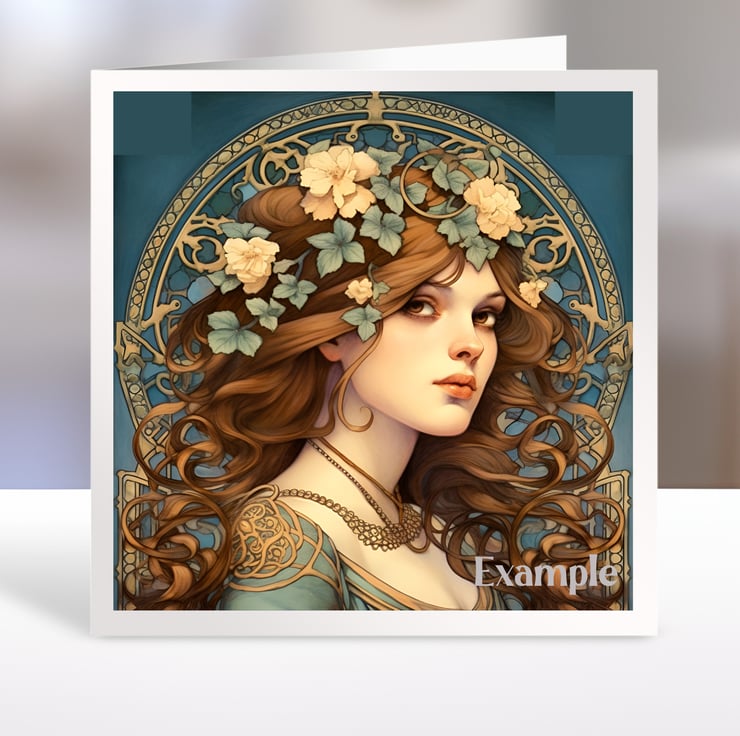 A set of six 3.5 inch square vintage style card toppers - Art Nouveau Ladies in the style of Alphonse Mucha