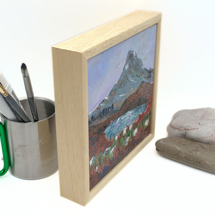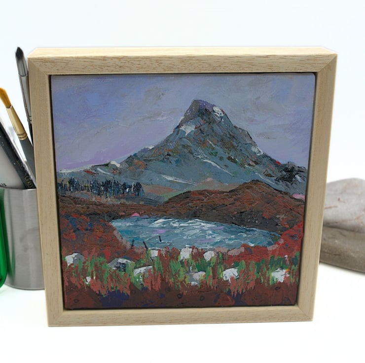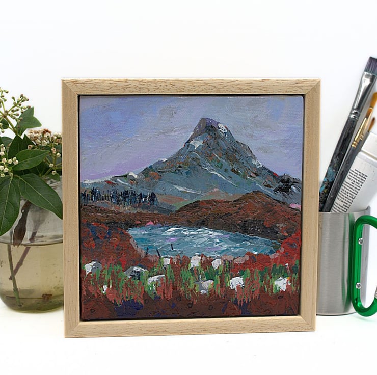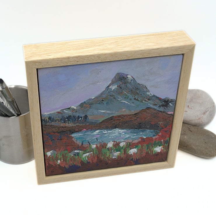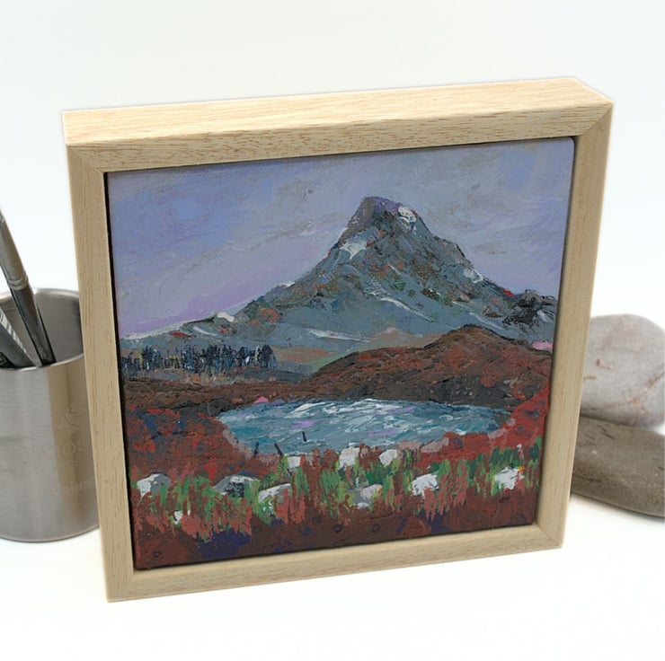 This is a framed landscape painting. Schiehallion is a mountain in Scotland. It stretches high and fills most of this canvas. I have used professional quality acrylic paints in this original scene. Layers of paint have been applied using a range of fine brushes, painting knives and my own hands.