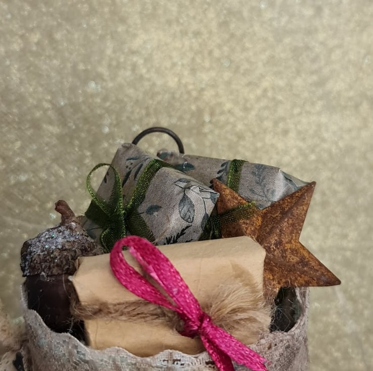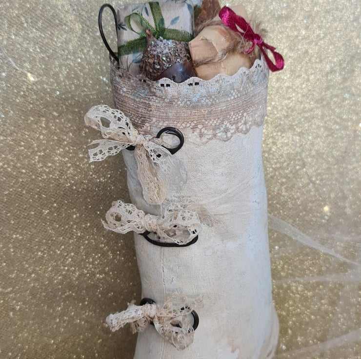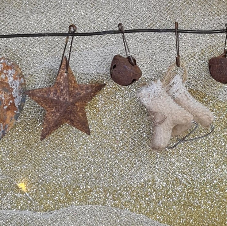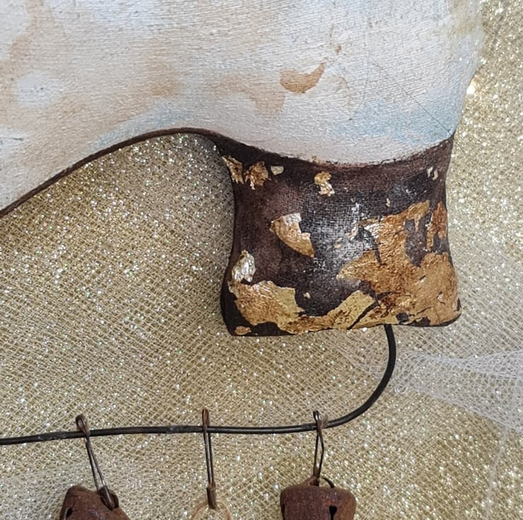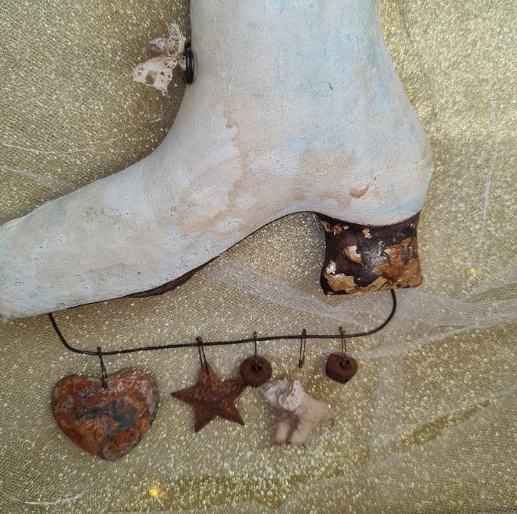 Made in unbleached cotton and hand painted and stained, gold foil layed on the heels to create the worn aged look. Rusted wire is used for the blade, eyelets and hook to hang from. Vintage style lace created to look a little stained is used for the trim and bows. I have handmade the miniature gifts and tiny skates that hang from the blade, alongside a rusty heart, bells and star.