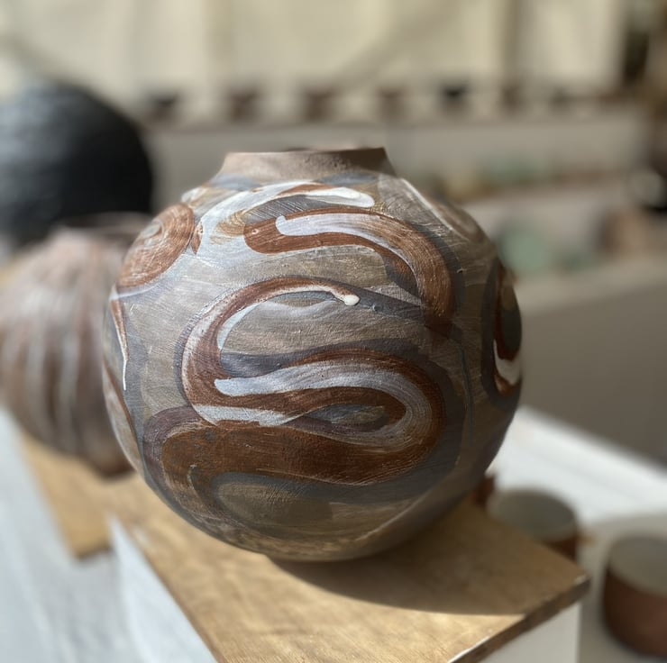 Hand coiled vessel with layers of slips, oxides and glaze to give a rich surface.