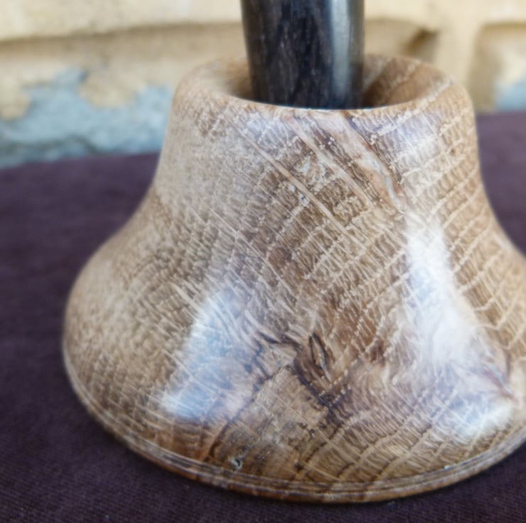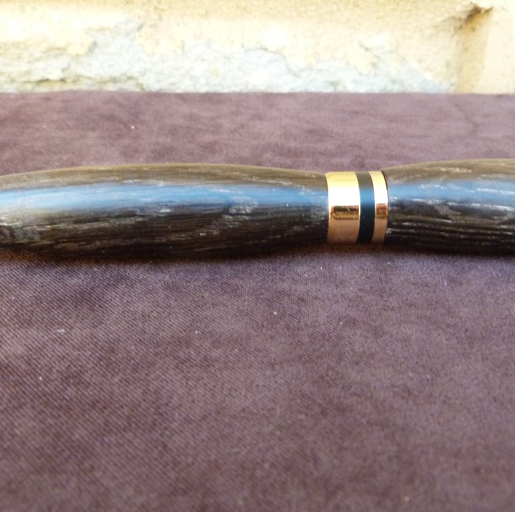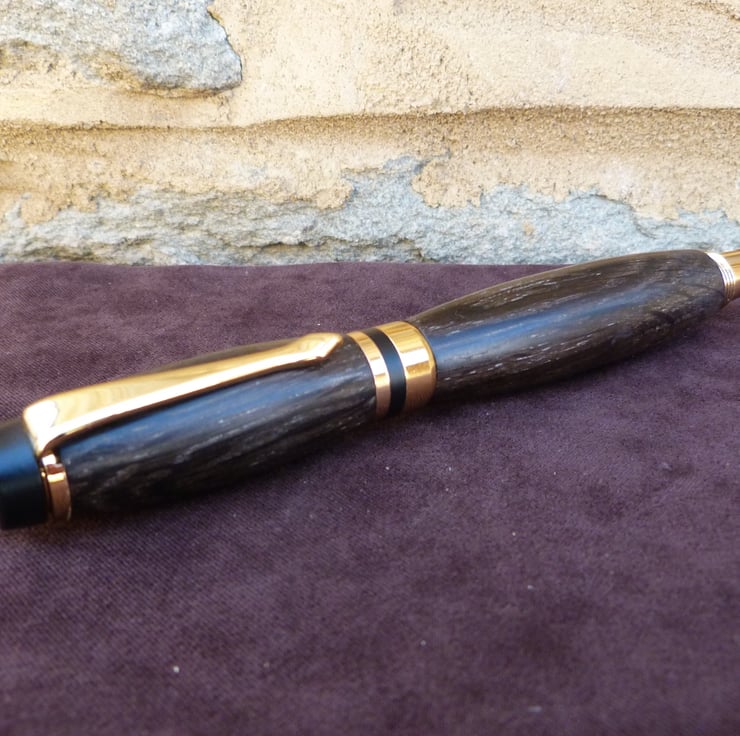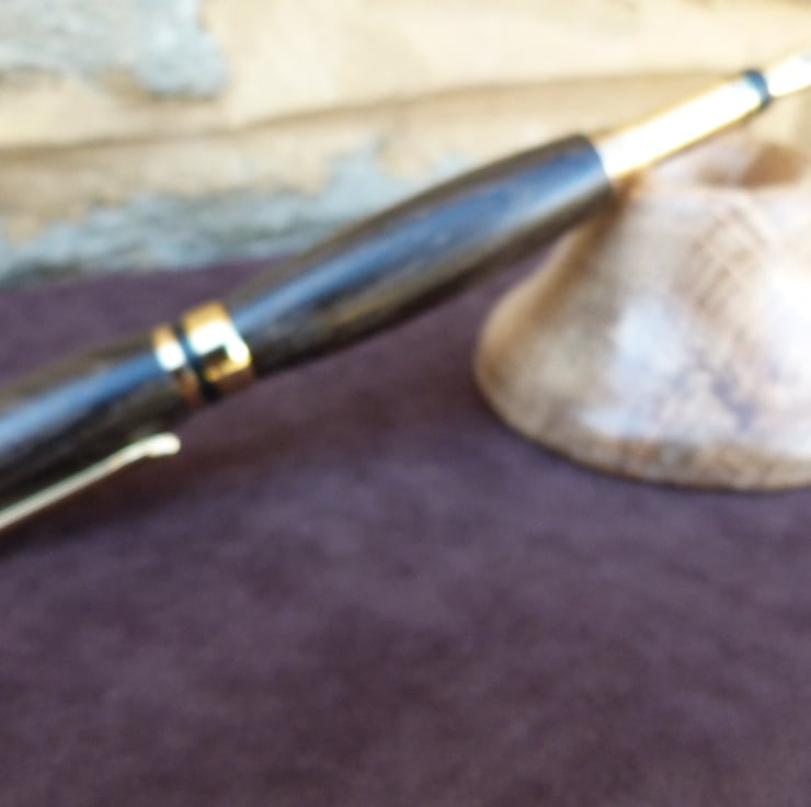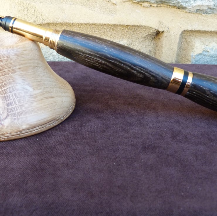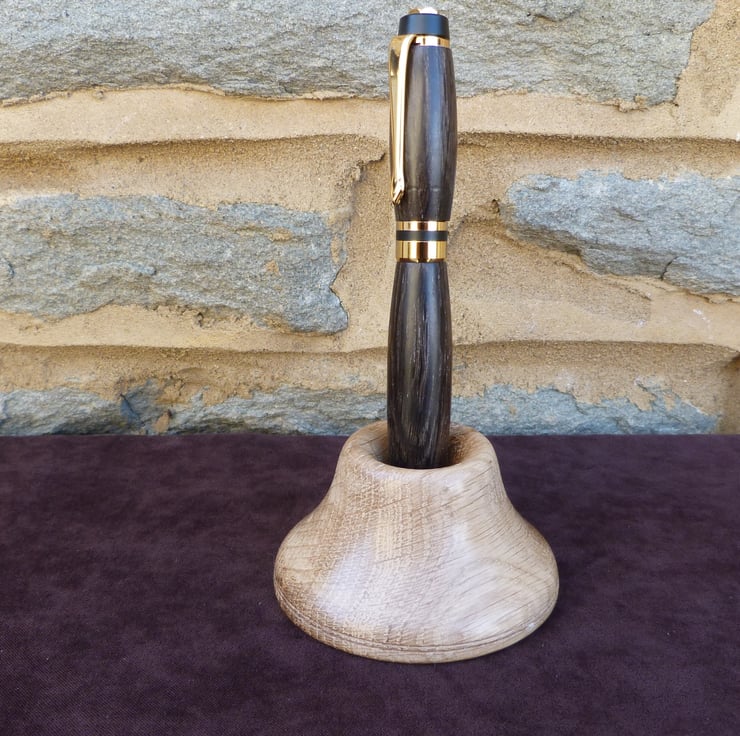 A fountain pen in bog oak,the piece comes with a desk top stand, also in oak. The colour is not the same bcause the stand has not been submerged in a peat bog for 2000 years plus, worth some interesting investigation. Bog oak turns well and is not at all soft, sands well and takes a good shine with wood wax.All my pens come with a replacement ink cartridge and UK postage is within the price.
