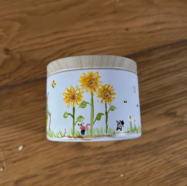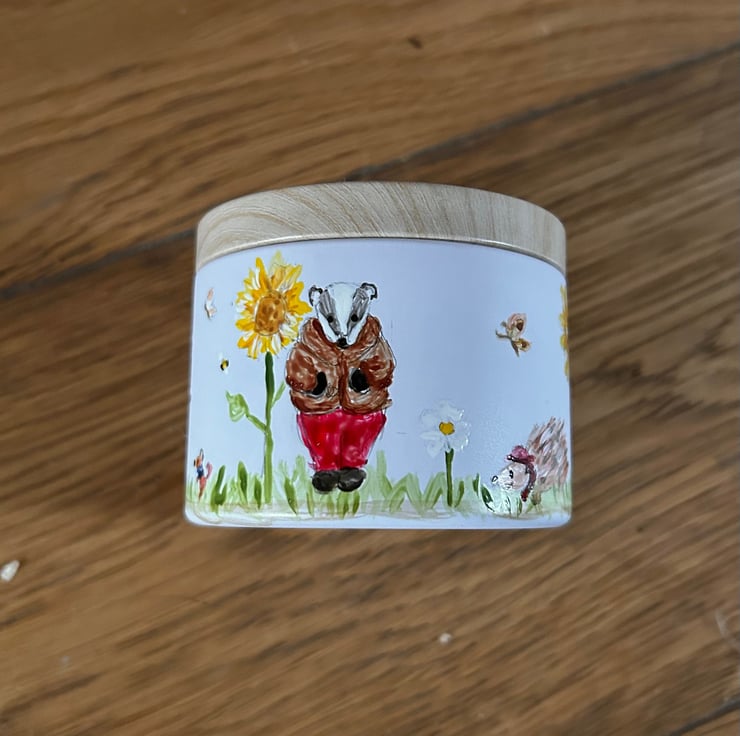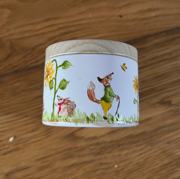 4oz (5cm high) candle tin hand painted with whimsical wildlife. Vanilla and strawberry scented hand made soy candle.