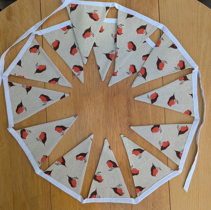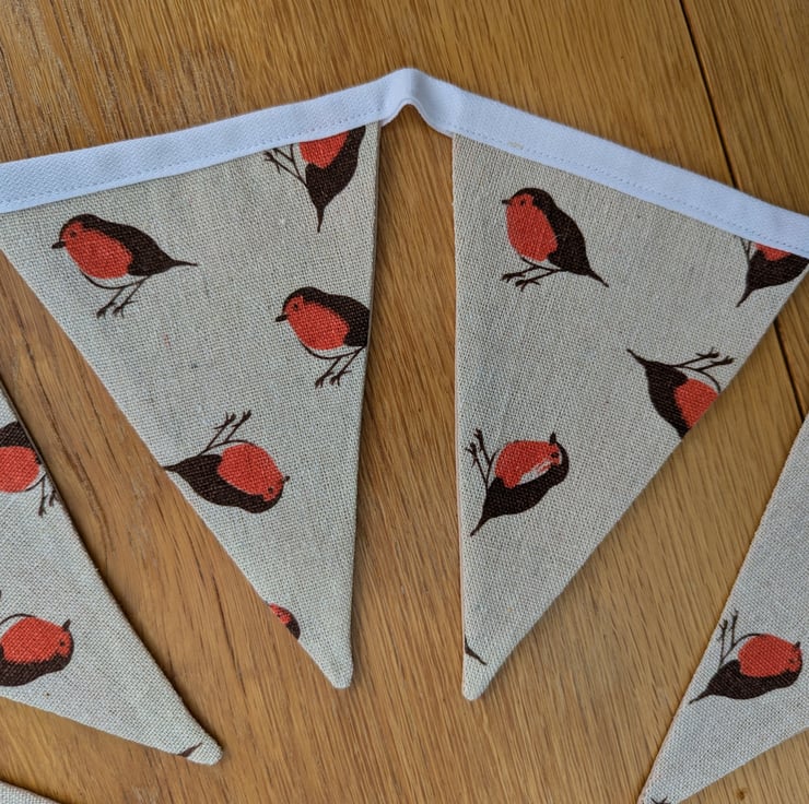 This festive bunting is made from heavier weight cotton fabric, and features a selection of robins. This has a rustic feeling and would suit many decorating themes. The flags have a plain cream fabric on the reverse, which gives a quality feel and helps the bunting hang well. The white tape measures approx. 2.7 metres, with the distance between first and last flag being 1.9m This gives a generous length of bunting, with ties at each end for hanging. Each of the 14 flags is 16cm (6.5 inches) deep.