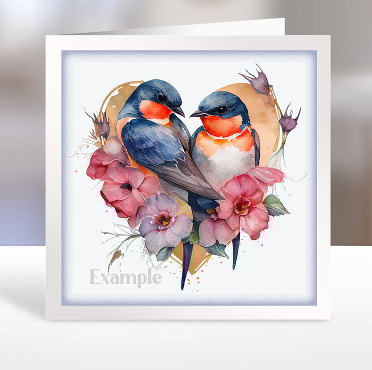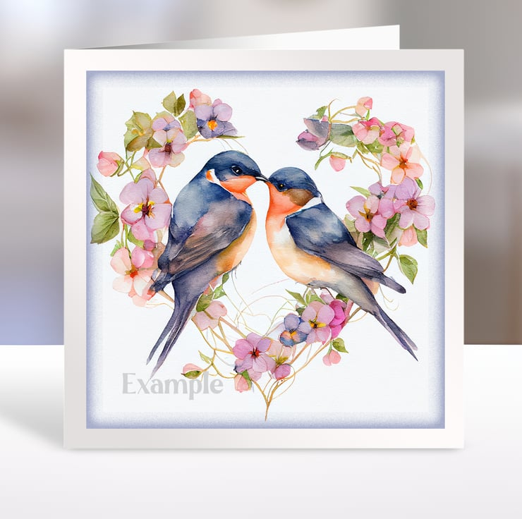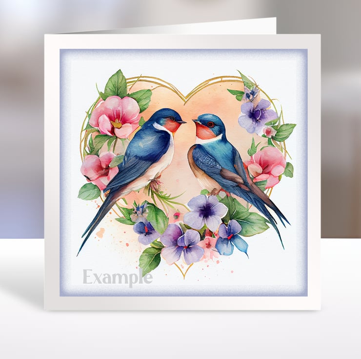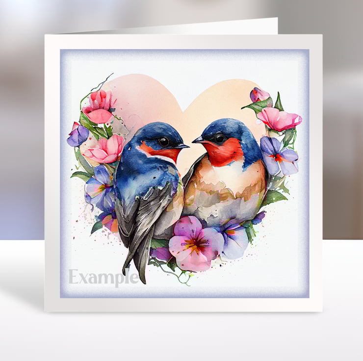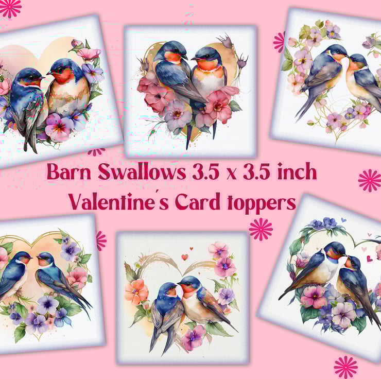 A set of six 3.5 inch square card toppers - Barn swallows - pairs of birds in heart shaped floral arrangements. Ideal for Valentine's day cards.