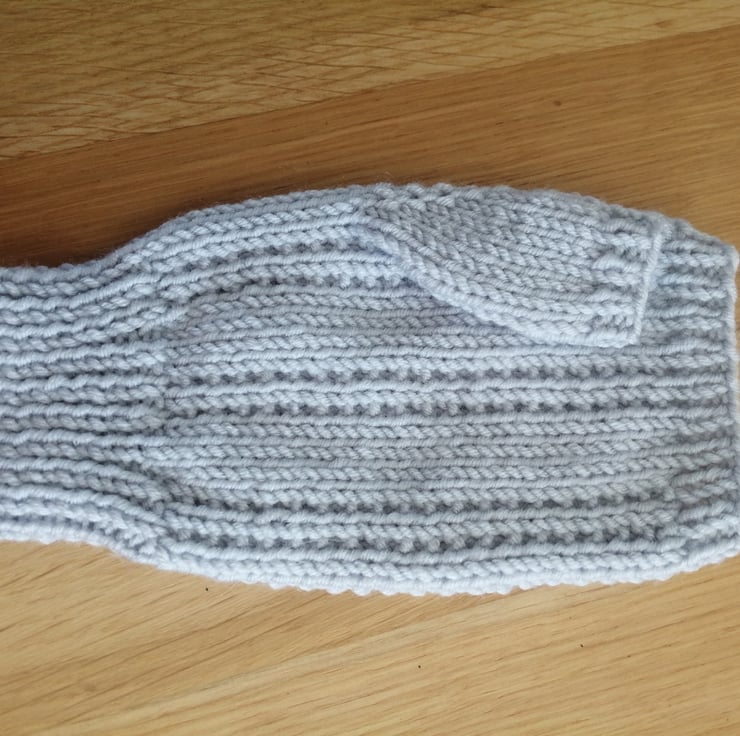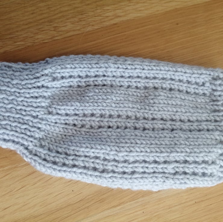 Hand knitted in a lovely light grey, machine washable acrylic yarn.