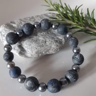 The handmade clay beads measure between 14.5 and 17.5mm with 12mm olive green pearly rounds and 10mm taupe ‘miracle’ beads and tiny green seed beads to finish.