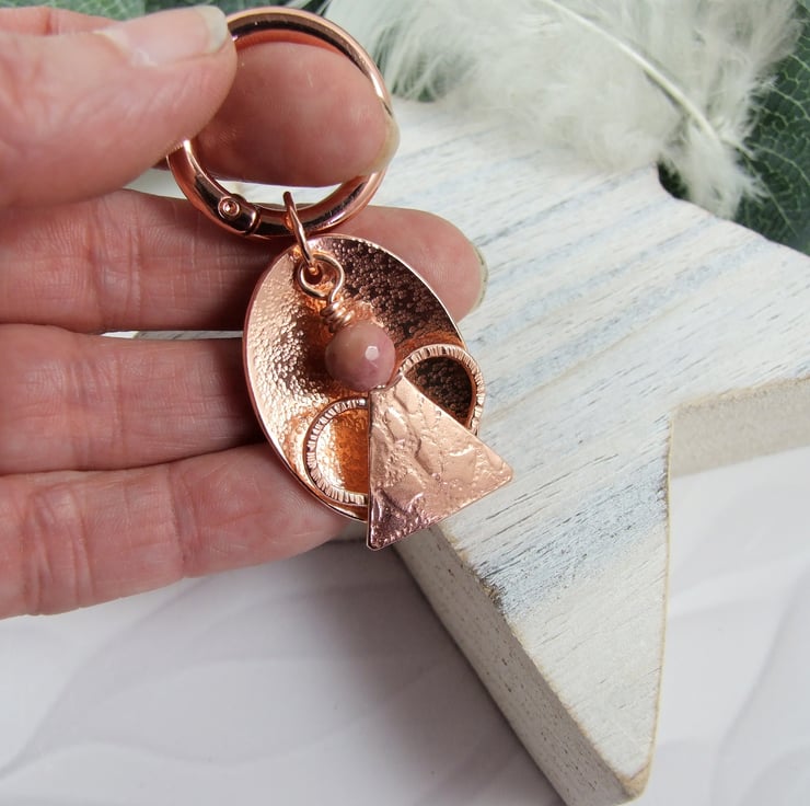 I have created the guardian angel entirely by hand. The base is made from pure copper sheet, cut and hammered for texture. The angel shape has been hand drawn onto copper sheet, cut out and textured with a lace pattern. The wings are formed from a heart shape made from copper wire soldered onto the back and an extra wire has been soldered to affix the rhodonite gemstone which is securely wire wrapped in place. Fitted to a copper stainless steel spring ring, but this could easily be removed and replaced with ribbon or cord to turn it into a hanging decoration or Christmas tree decoration.