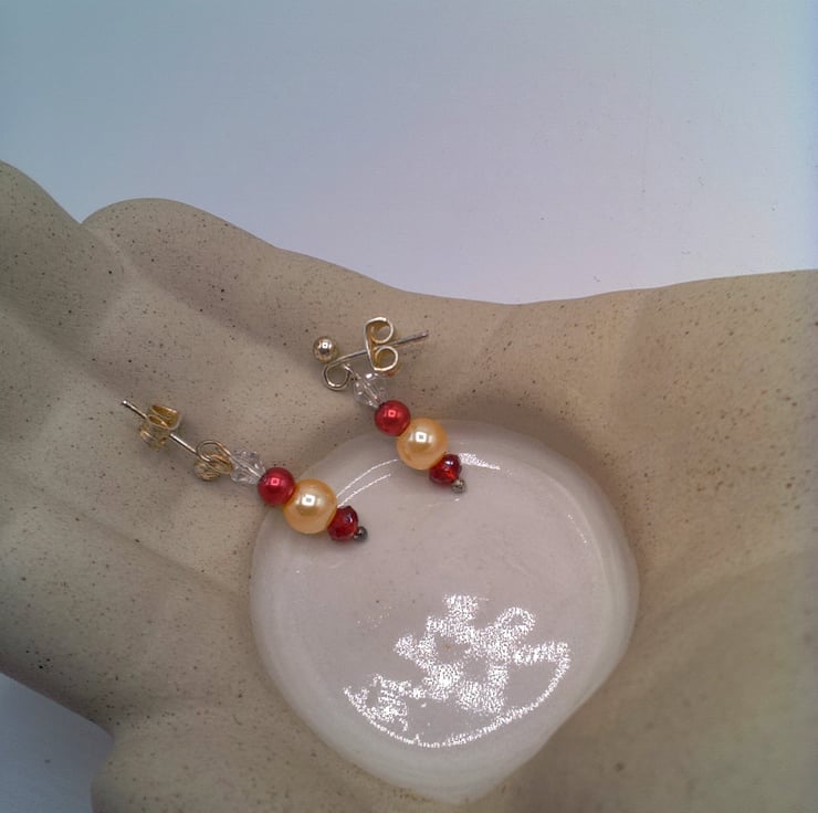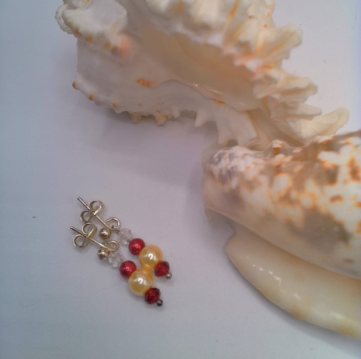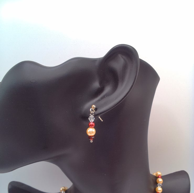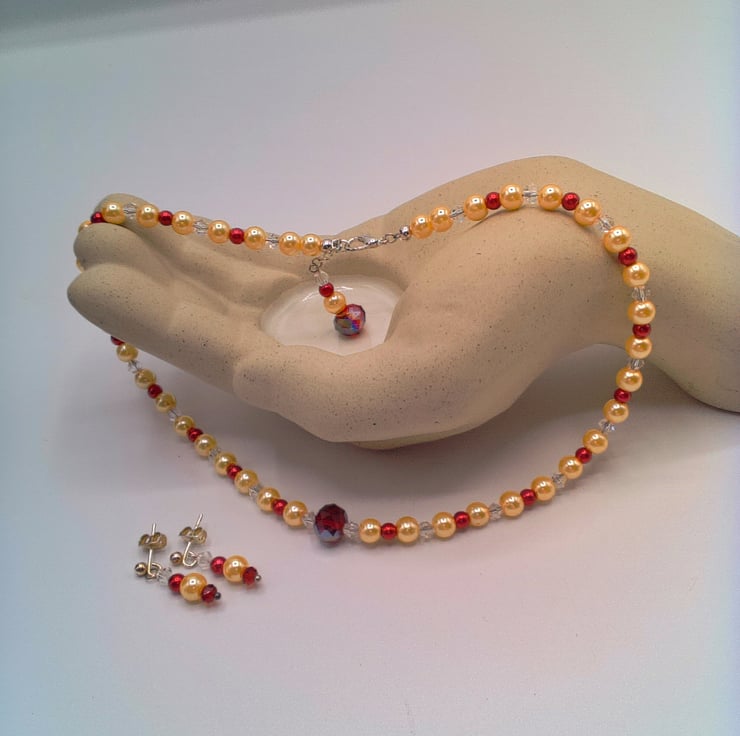 This beautiful jewellery set for comprises a necklace and a pair of stud earrings. It would look great for a party or special occasion. The necklace is made using 6 mm champagne glass pearls, 4 mm red glass pearls and 4 mm clear crystal bicone beads with a 10 mm Scarlet Crystal Rondelle Bead at the centre. The extender chain with 2 pearls and a scarlet crystal. The necklace is fastened with a silver plated lobster clasp. The earrings have a 4 mm crystal bicone, a 4 mm red glass pearl, a 6 mm champagne glass pearl and a 4 mm red crystal bicone bead and silver plated Stud. The necklace is 38 cm (15 inches) in length and it has a silver plated lobster clasp and a 4 cm (1.5 inch) dangle at the back which can be used as an extension to make the necklace longer. The earrings have a 2.25 cm (0.75 inch) drop and they have a silver plated ear studs. The jewellery set will be dispatched wrapped in tissue paper in an organza bag and delivered to you via Royal Mail first class post. The set would make a lovely gift for a special occasion.