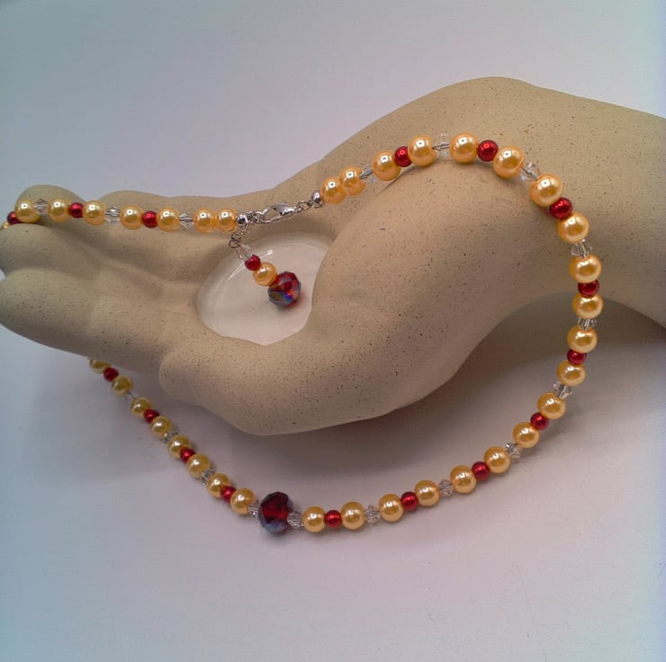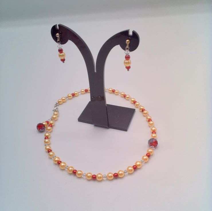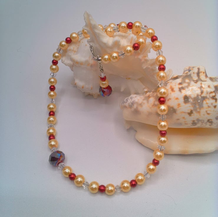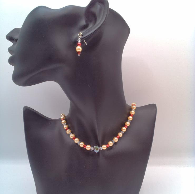 Champagne and Red Pearls and Crystal Bicone Necklace and Earrings, Gift for Her, 2 Piece Jewellery Set, Pearl and Crystal Jewellery, Pearl Necklace, Pearl Bracelet, Pearl Earrings