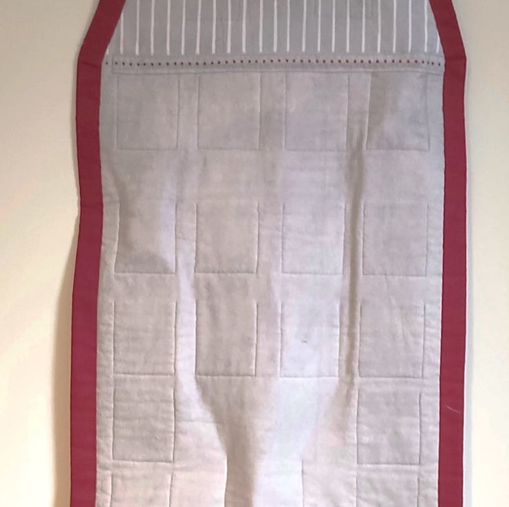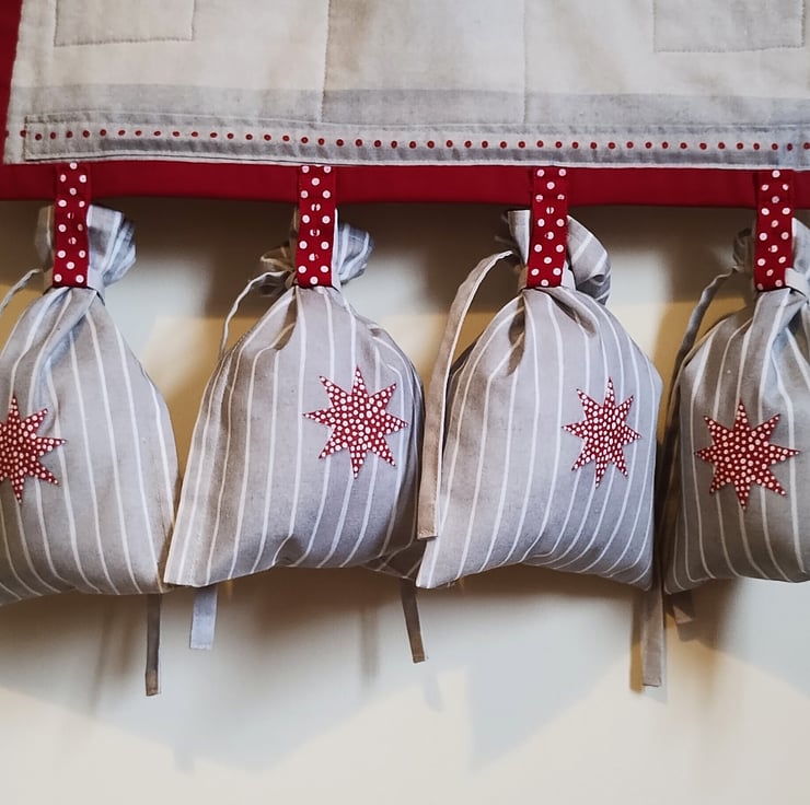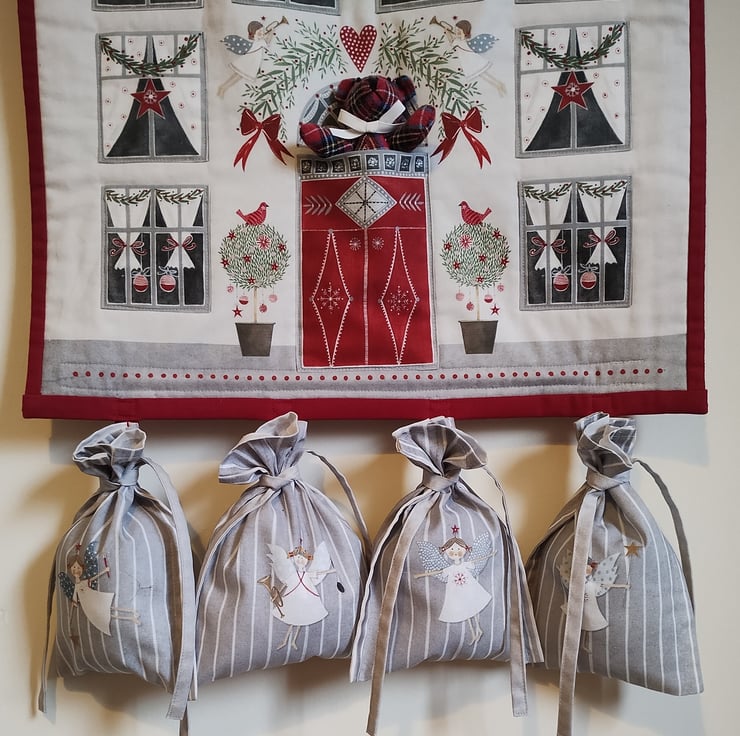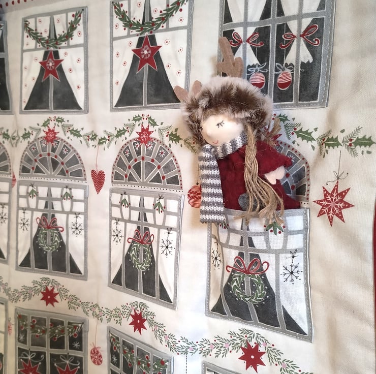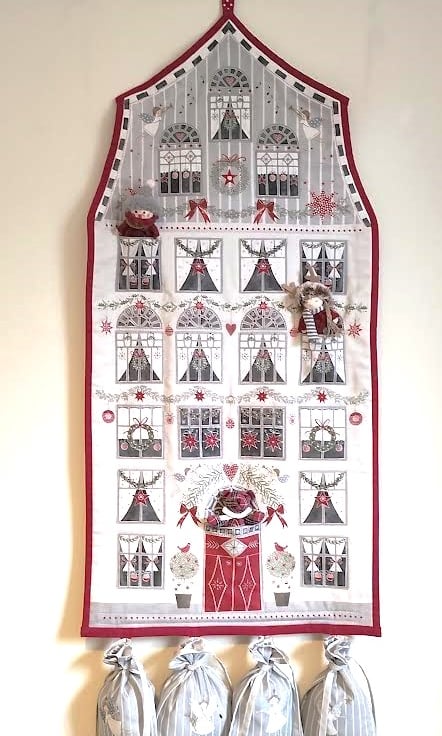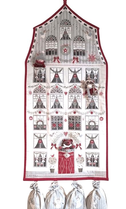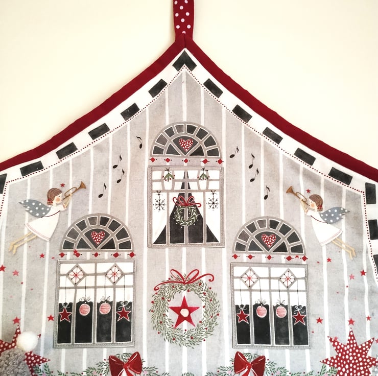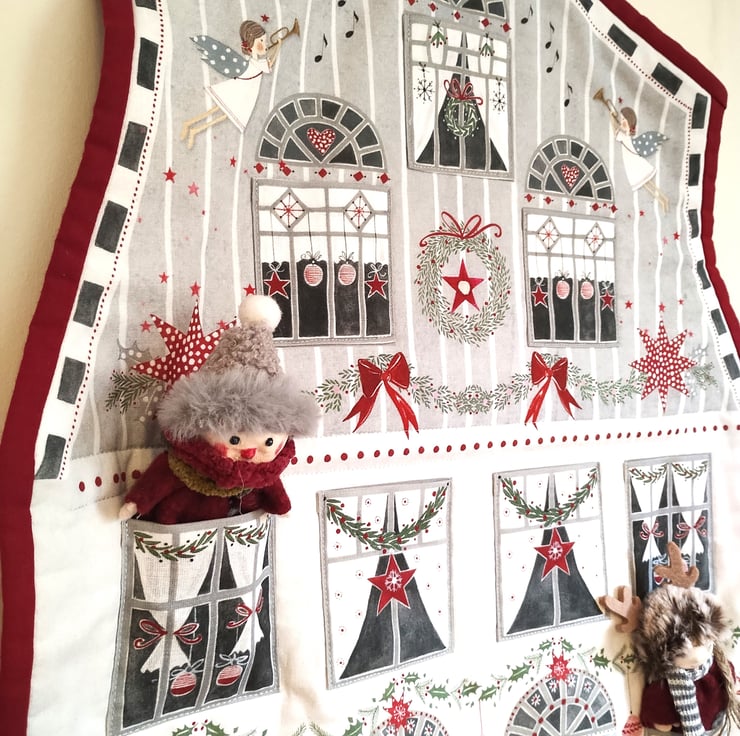This striking advent calendar shows a beautifully detailed house with lavishly decorated door and windows along with trumpet blowing angels. In modern shades of grey, red, green and a soft black, there are 19 window pockets and 4 gift bags that hang from the bottom making this a beautiful heirloom piece to pass down the generations.. There are two wooden dowels keeping the calendar in shape. A beautiful Christmas gift.
