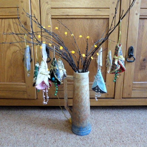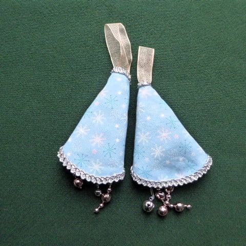 Christmas blue snowflake fabric, braid decorated, hanging bell shapes with beads, ribbon and little sparkly bells.