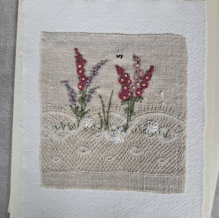 More than a card! Hand embroidered on vintage linen and mounted on a piece of handmade paper on a blank card for your own message. Ideal for when you want to give more than a card as this beautiful card can be framed afterwards.