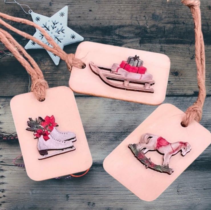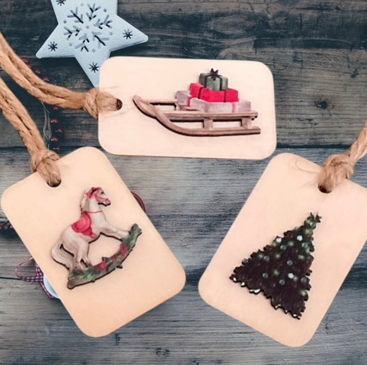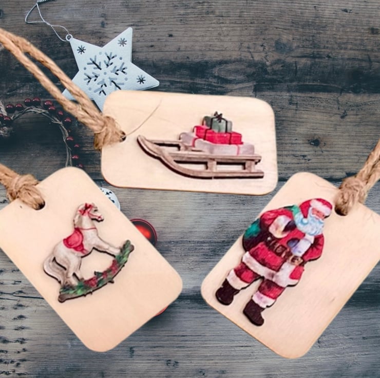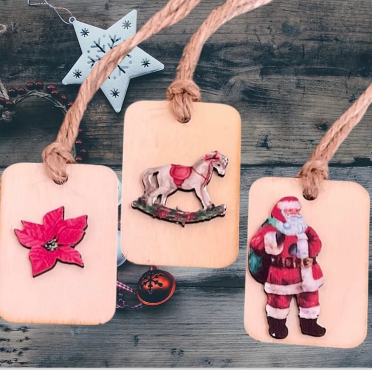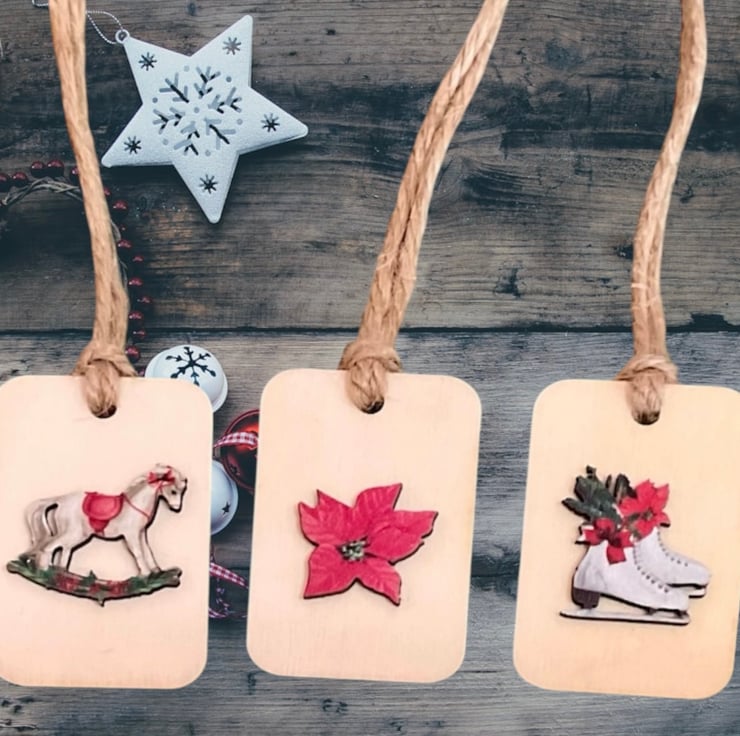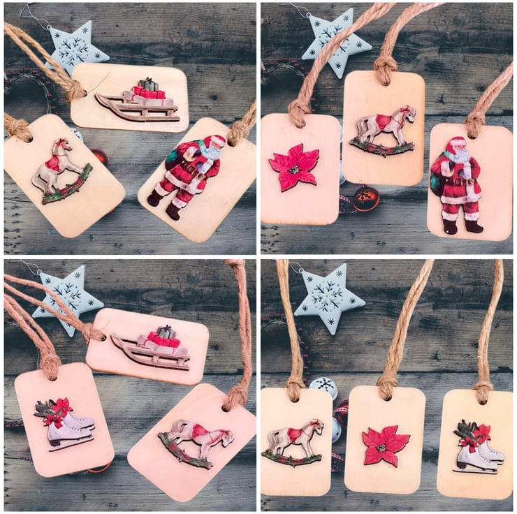 Add a touch of rustic charm to your gifts this Christmas. These little gift tags feature a decorated wooden token of various designs including Santa, ice skates and a Christmas tree.