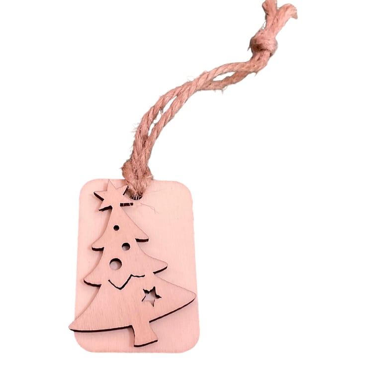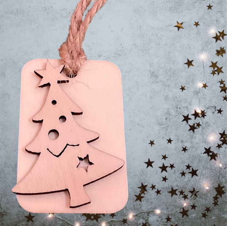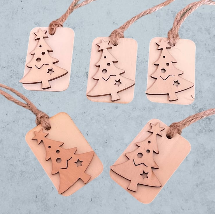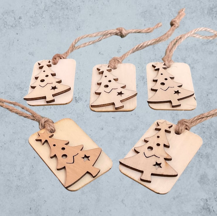 The tags feature a wooden Christmas tree which has been applied to a wooden tag. A length of jute has been added for you to apply the tags to your gifts.