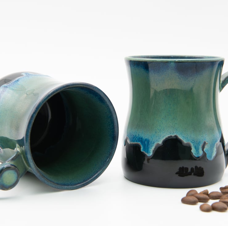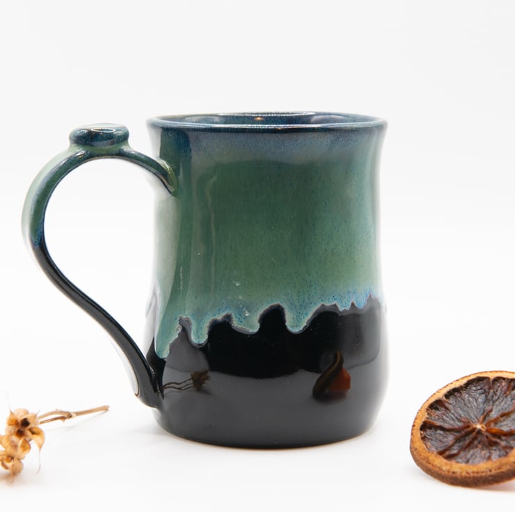 High gloss black glaze inside and out, with the addition of a running over glaze breaking green-blue.