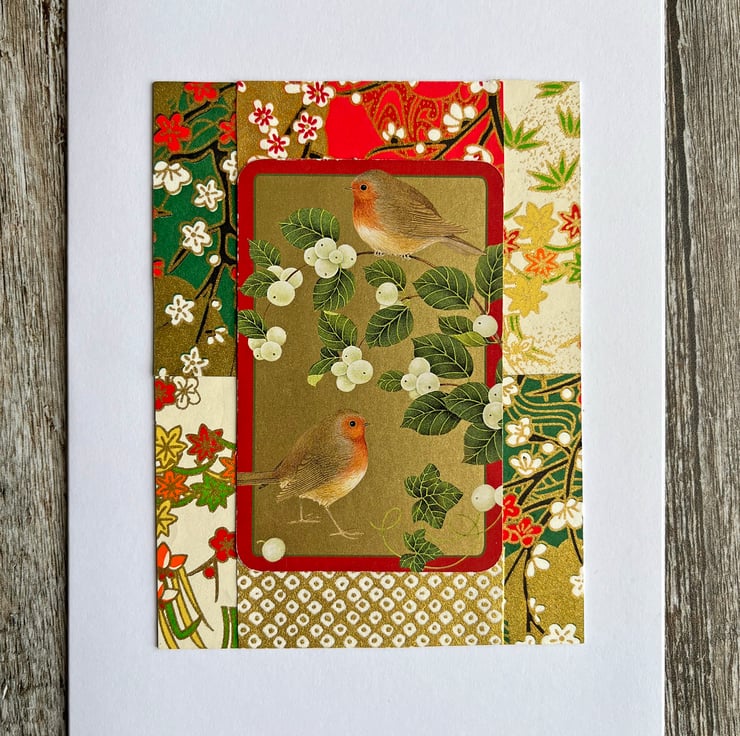 I've made a little collage using a pretty vintage playing card featuring a pair of robins amongst the mistletoe. The playing card has a metallic gold background so has a lovely festive shimmer. I've bordered it with a selection of origami papers in shades of gold, green and red. There are touches of metallic gold in the origami papers which adds a bit more sparkle.