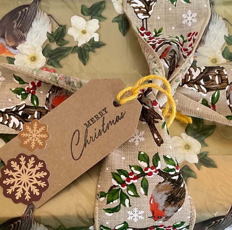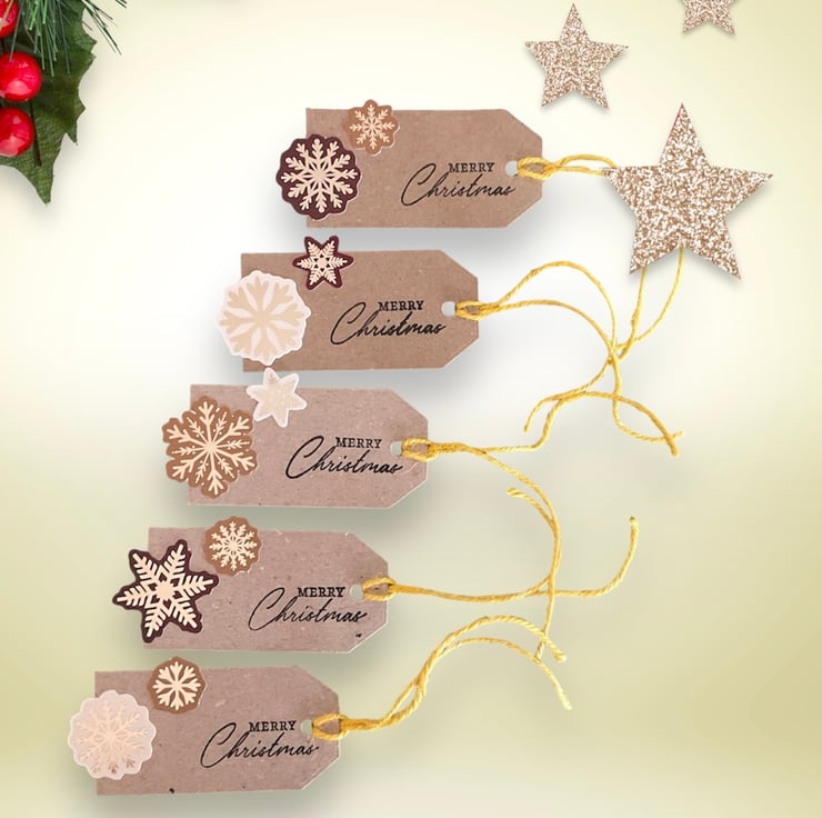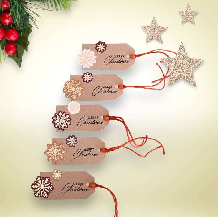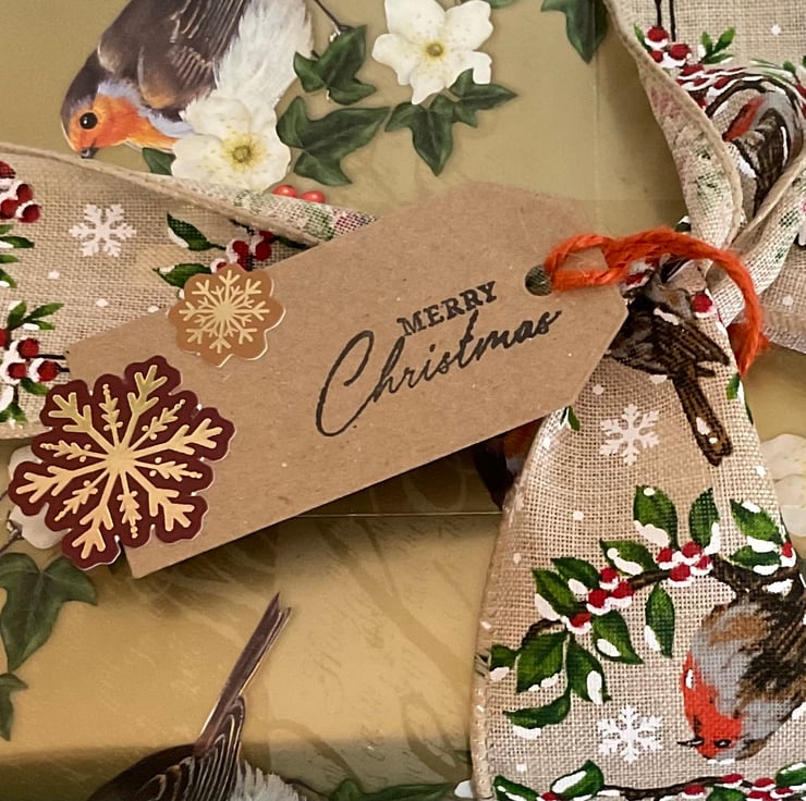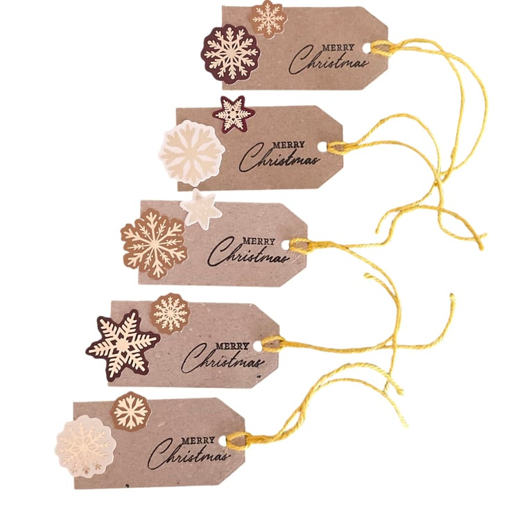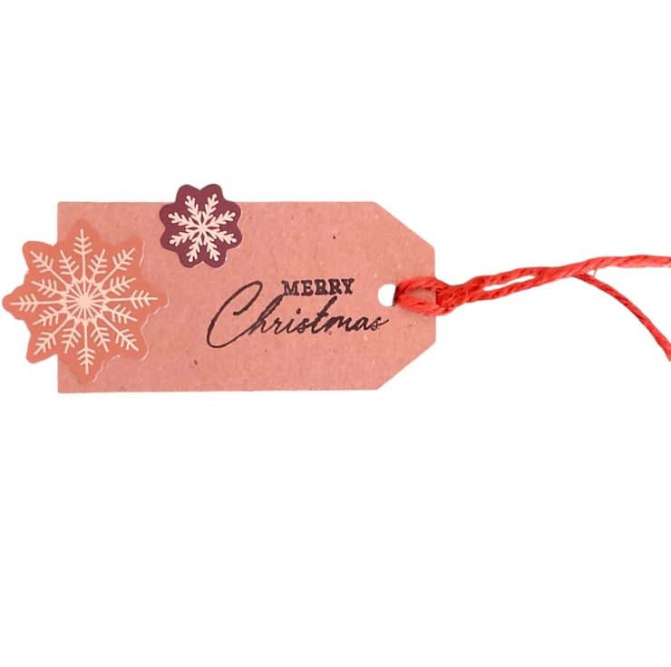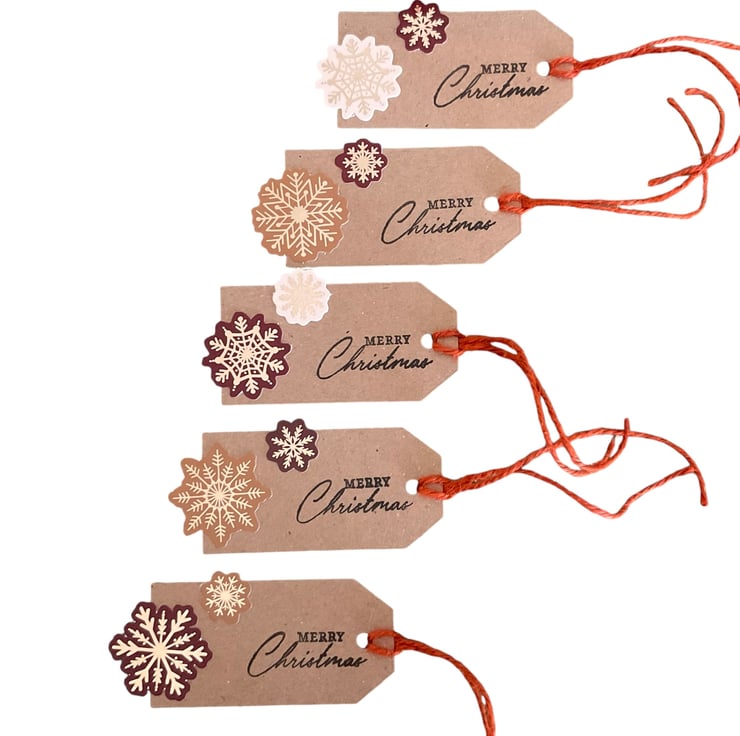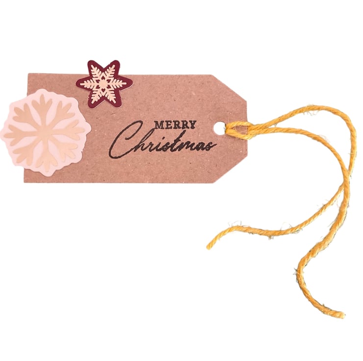 Each gift tag features die cut snowflakes and has been hand stamped with the greeting Merry Christmas. A length of twine in either yellow or orange has been added for you to attach the tags to your gifts. Please select which option you would prefer.