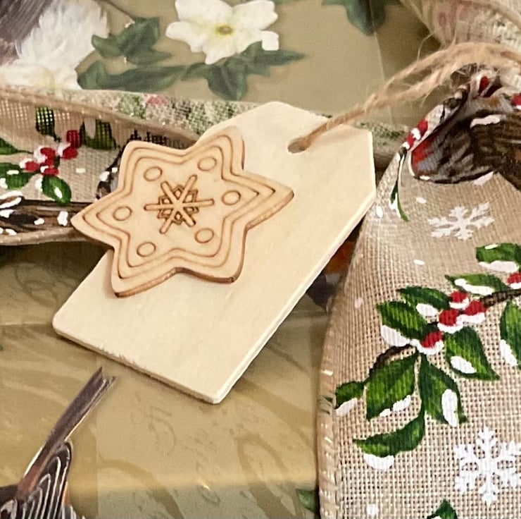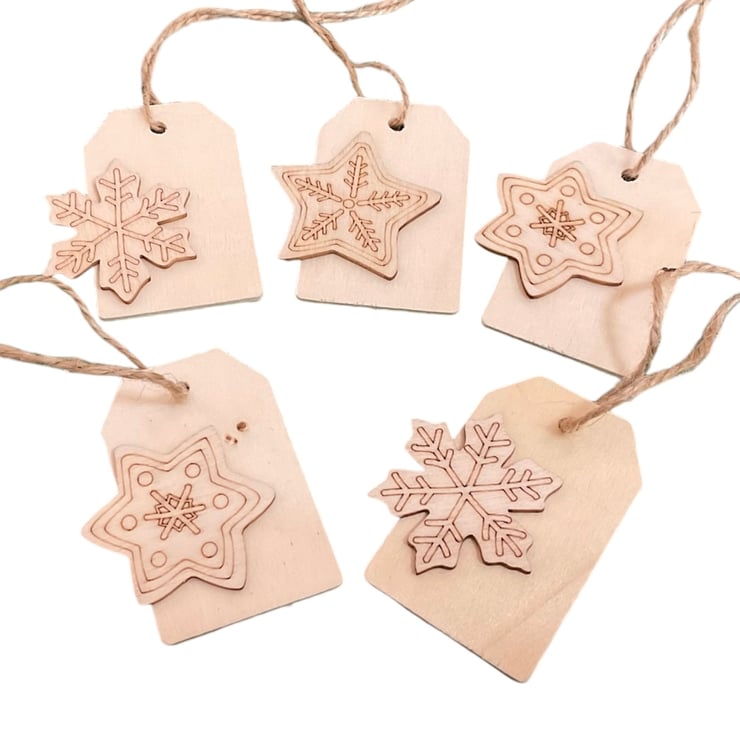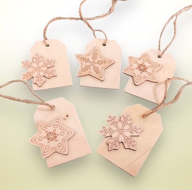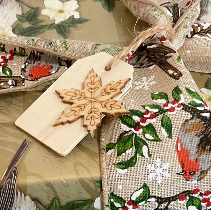 The tags feature a wooden snowflakes which has been applied to a wooden tag. A length of jute has been added for you to apply the tags to your gifts.