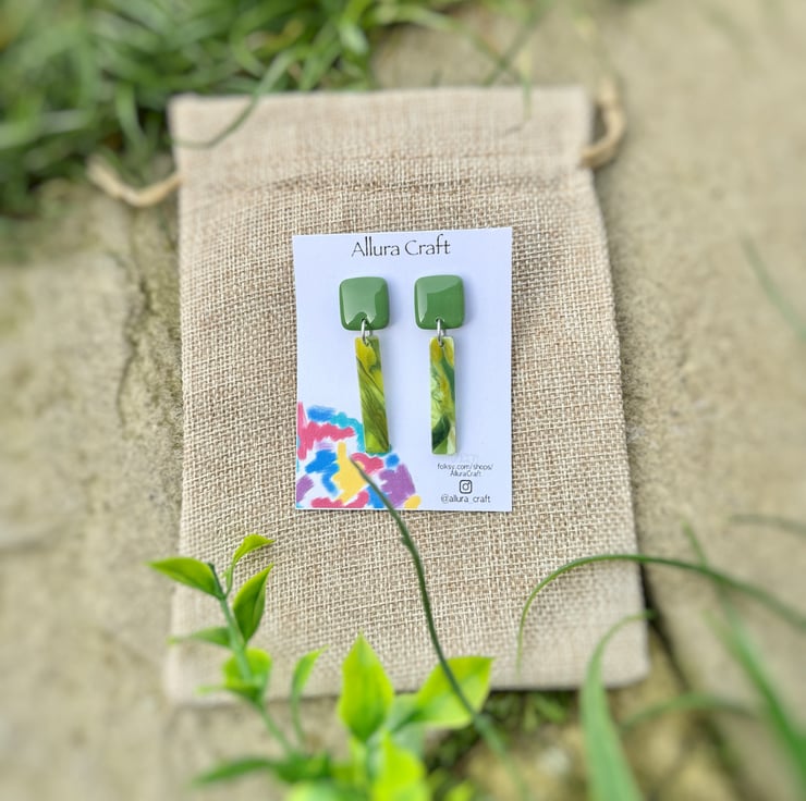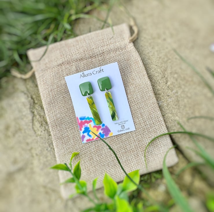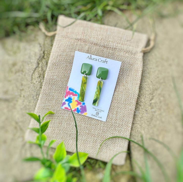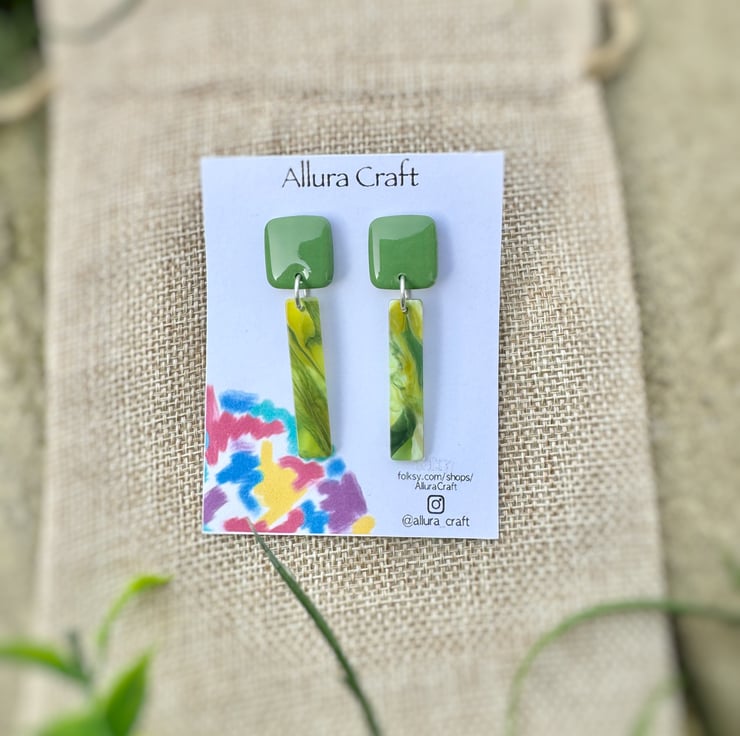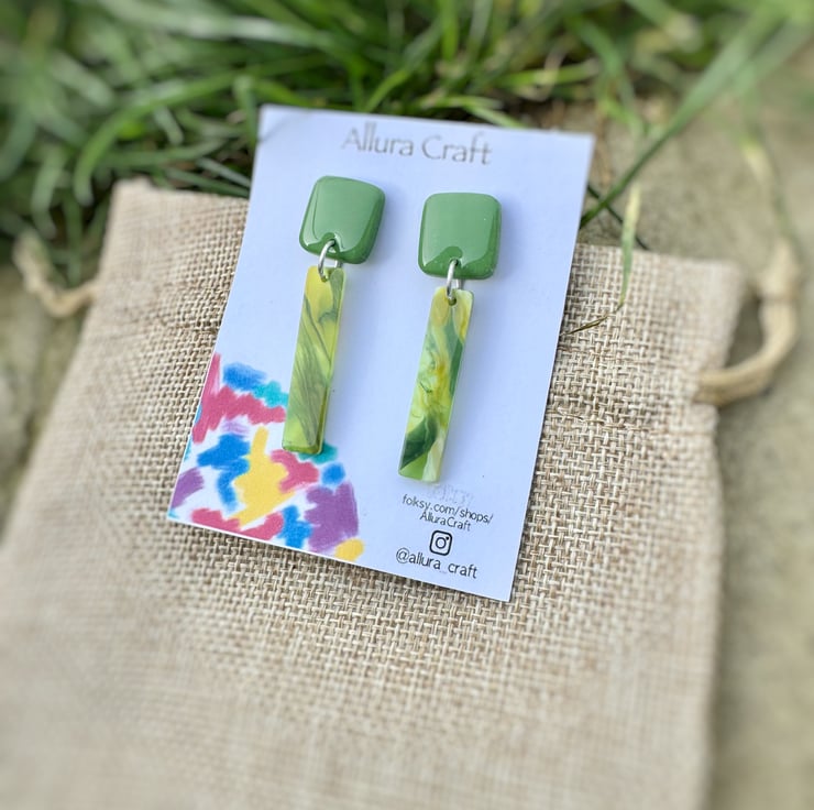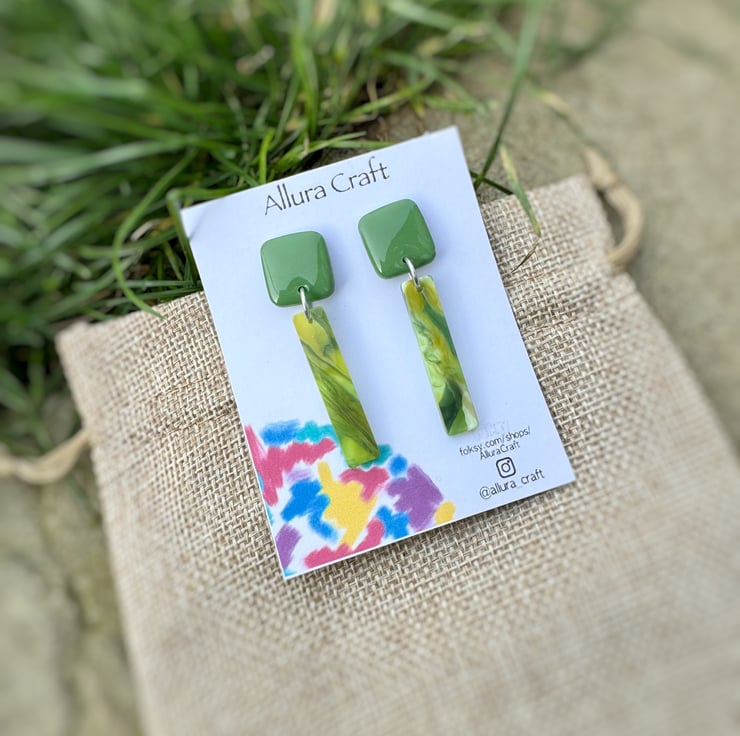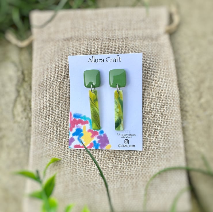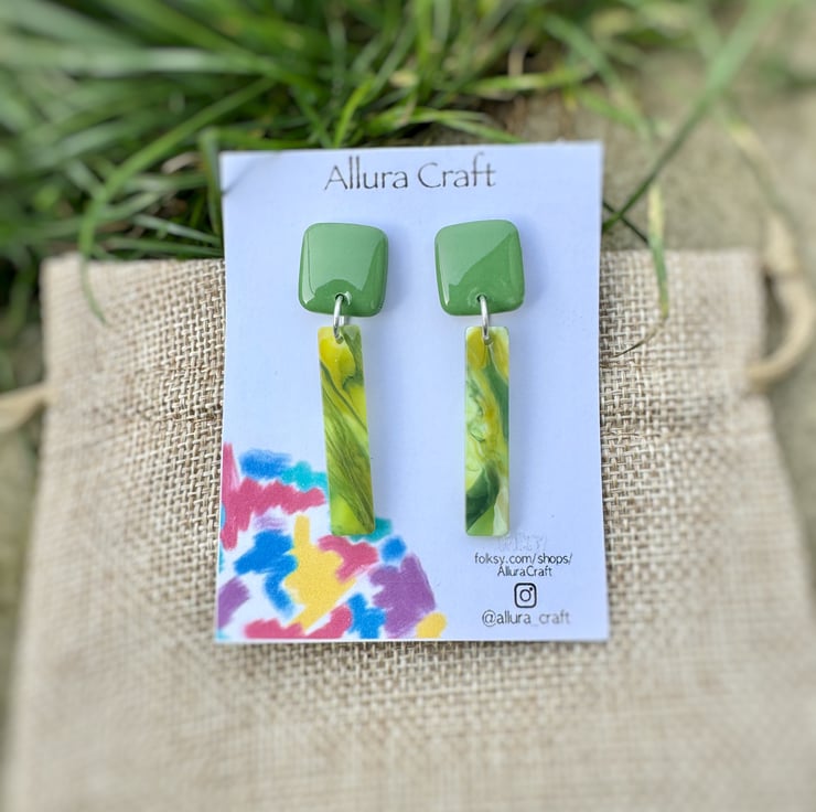 Attached to a slim rectangle drop of swirled green hues of acrylic