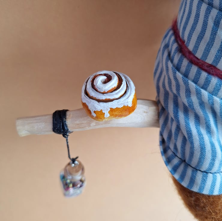 The broom is made from hand whittled wood, and her sweet treats crafted from polymer clay.