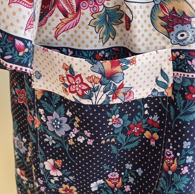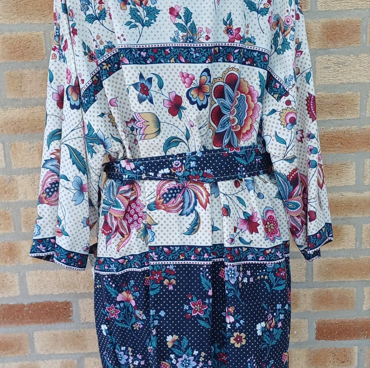Featuring an all over floral print, with a cream top half and navy blue bottom half, 2 large patch pockets on the front, internal ties to help keep your modesty, and a self tie belt with belt loops as well as a hanging loop.