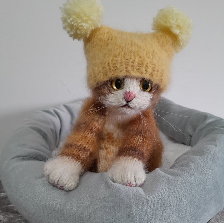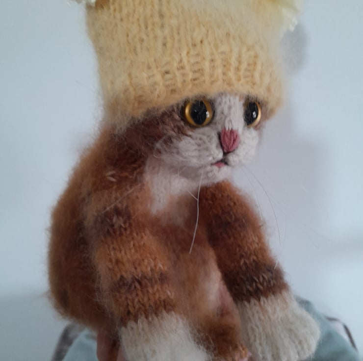 To keep her tiny ears warm she wears a fluffy mohair hat.