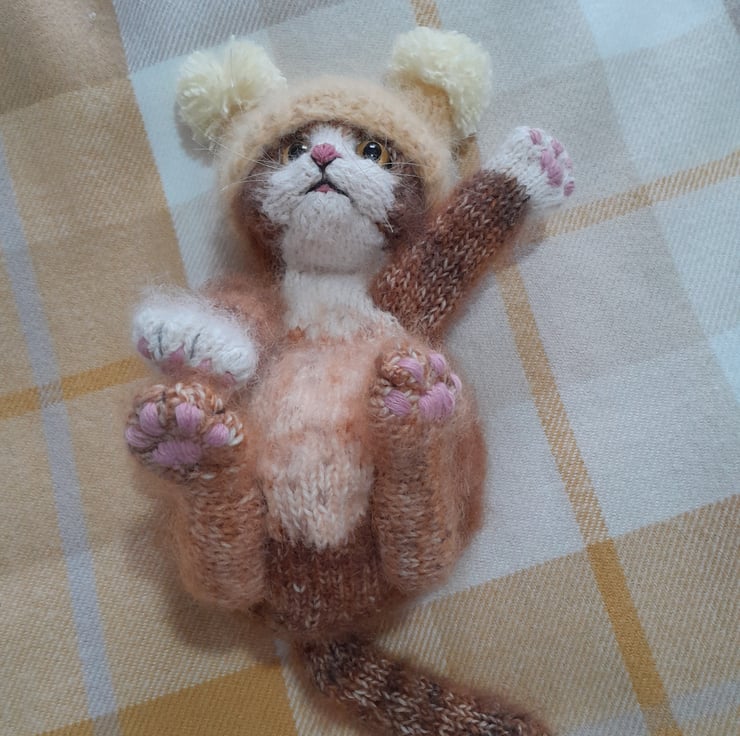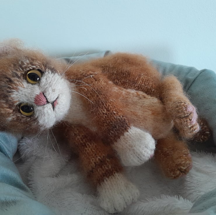 She is knitted in alpaca yarn with two different strands of kid silk mohair to create that tortie appearance and brushed to make extra fluffy.