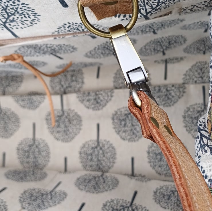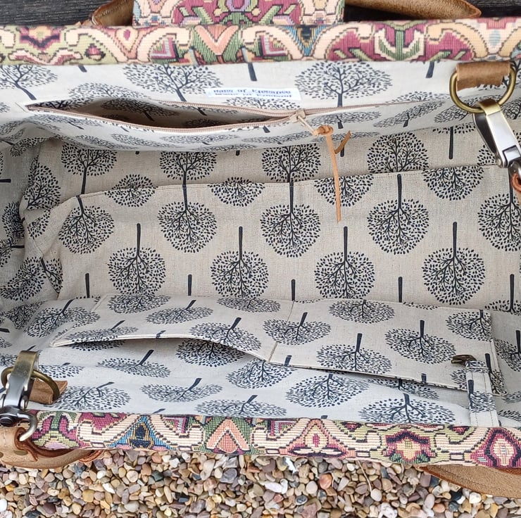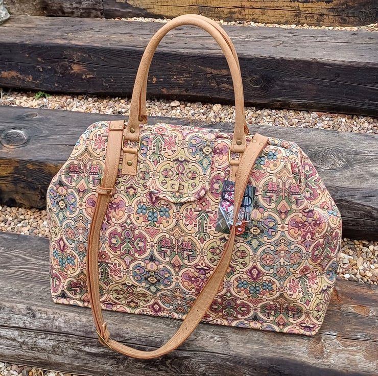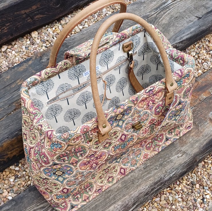 Mary Poppins style carpet bag Moors tapestry weekend bag with leather handles