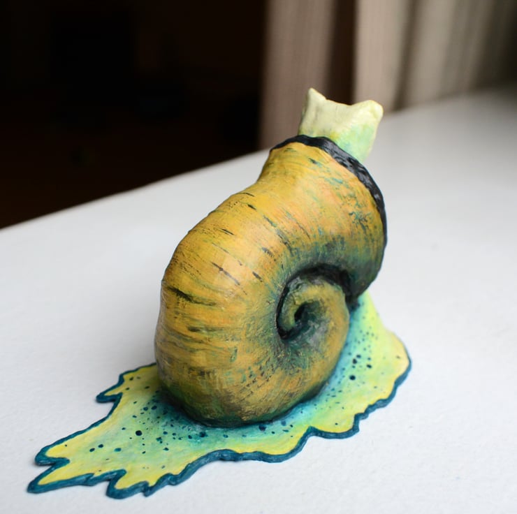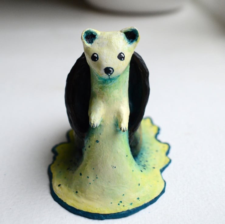 This tiny mustelid (a stoat perhaps!) lives in a shell, and its lower half resembles a colourful spotted sea snail. It is made of paper mache and durable air dry clay, then painted and coated with acrylic varnish. Measuring approximately 7 cm in height, this unique and absolutely adorable little character adds a touch of whimsy to any shelf or desk nook.