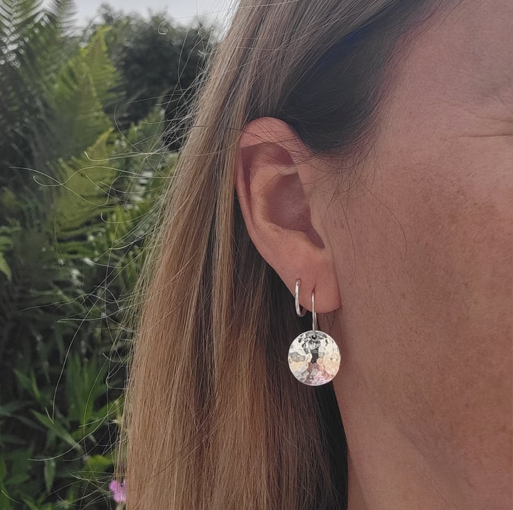 These earrings are made with 0.7mm Sterling silver sheet. Hammered to make a lovely sparkle effect.
