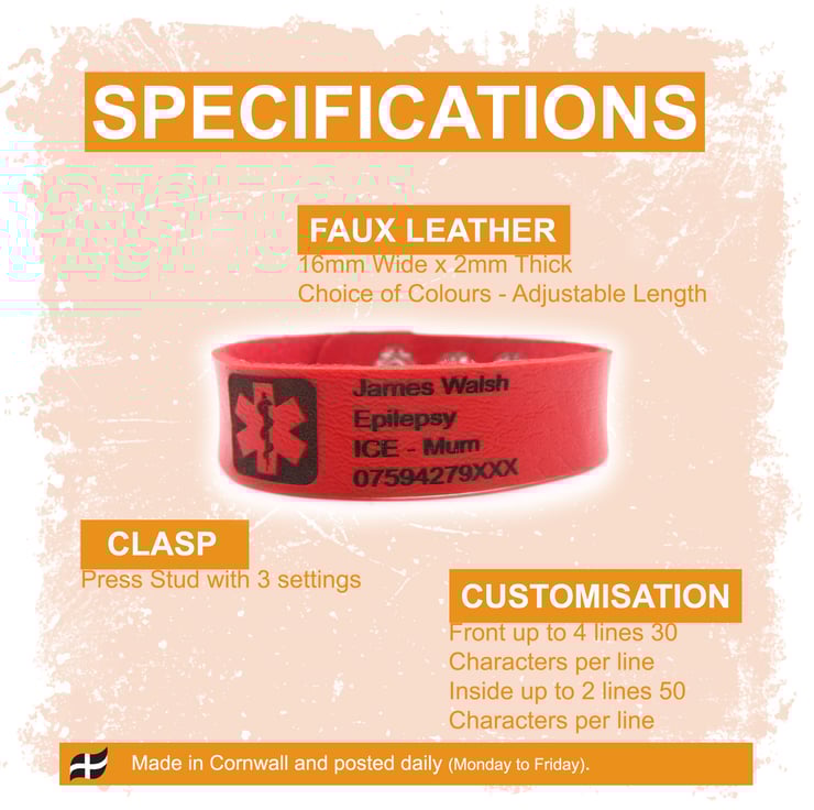 This medical ID bracelet doesn't just keep your vital information close at hand - it gives you and your loved ones peace of mind. With personalised engraving, the bracelet can display your name, medical conditions, emergency contacts, and other key details. The adjustable length and stylish faux leather design ensure a comfortable, discreet fit that complements any outfit.