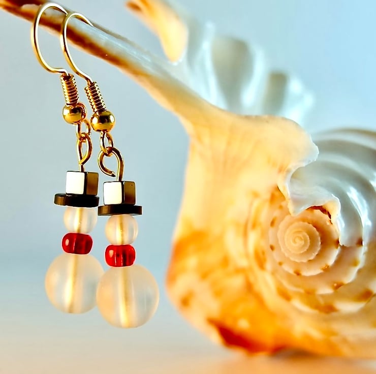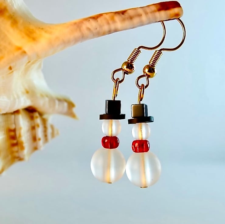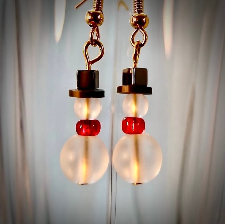 Each of these sweet little snowman earrings is made from frosted glass beads for the body and head.