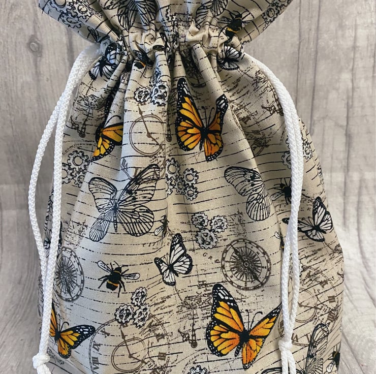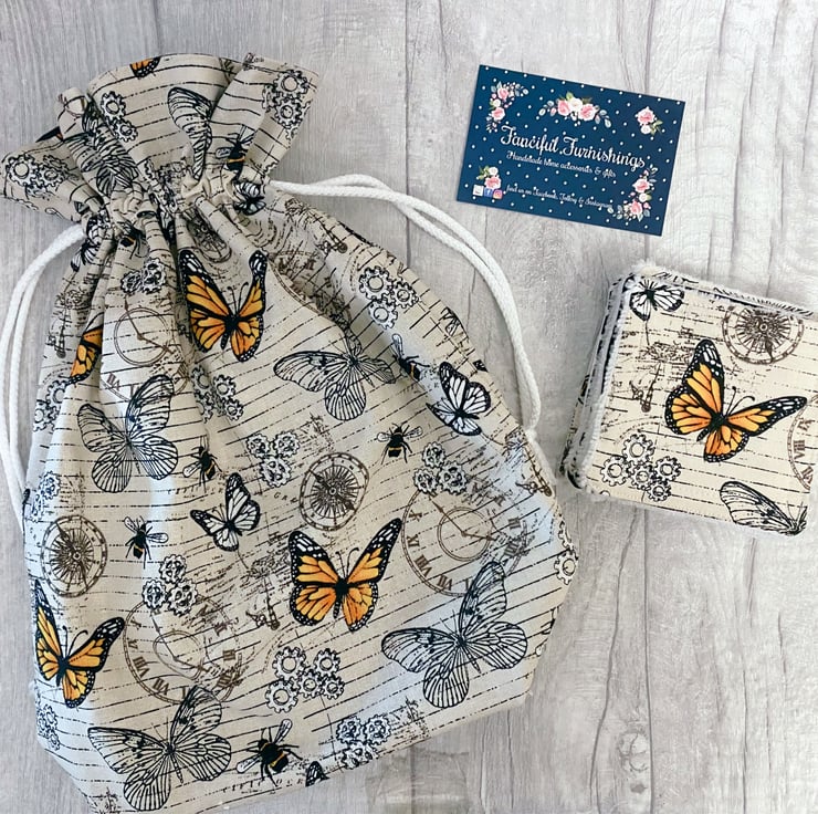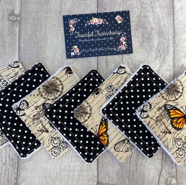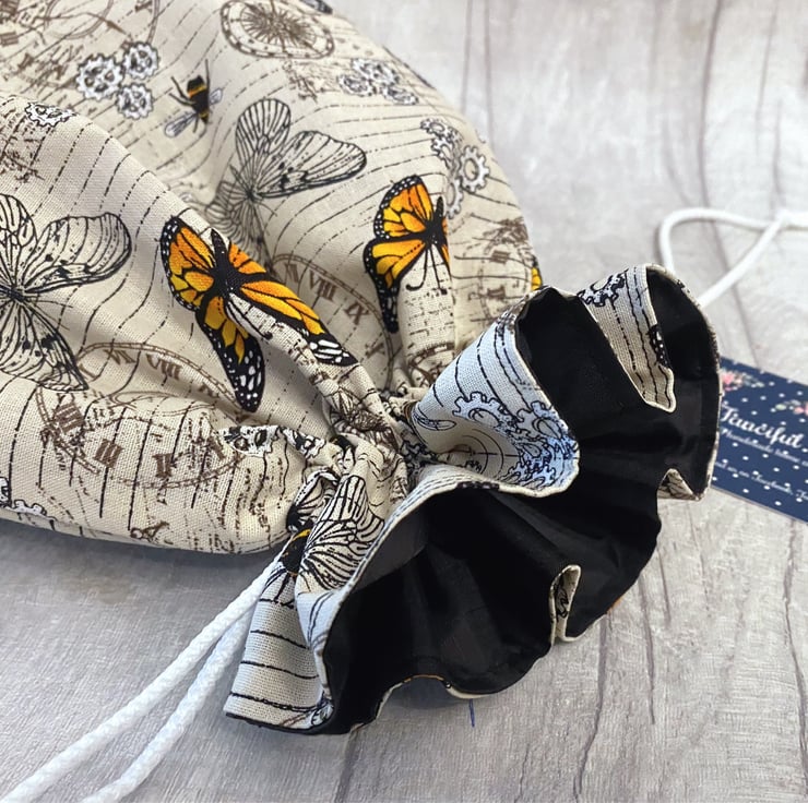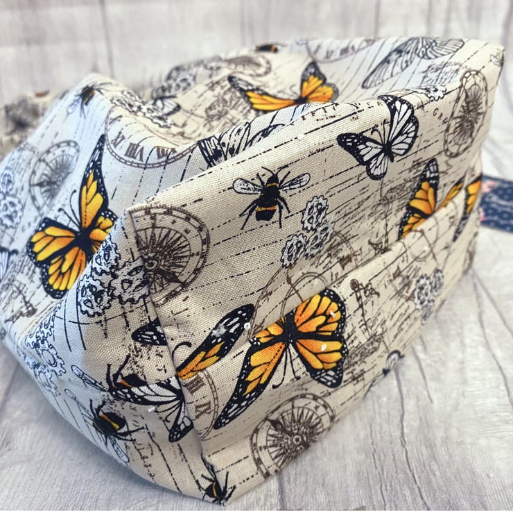 I’ve used a cotton fabric with butterfly motifs and a slight steampunk feel matched up with a black polka dot on the wipes which give a bold contrast. The wash bag is lined with black water resistant fabric.