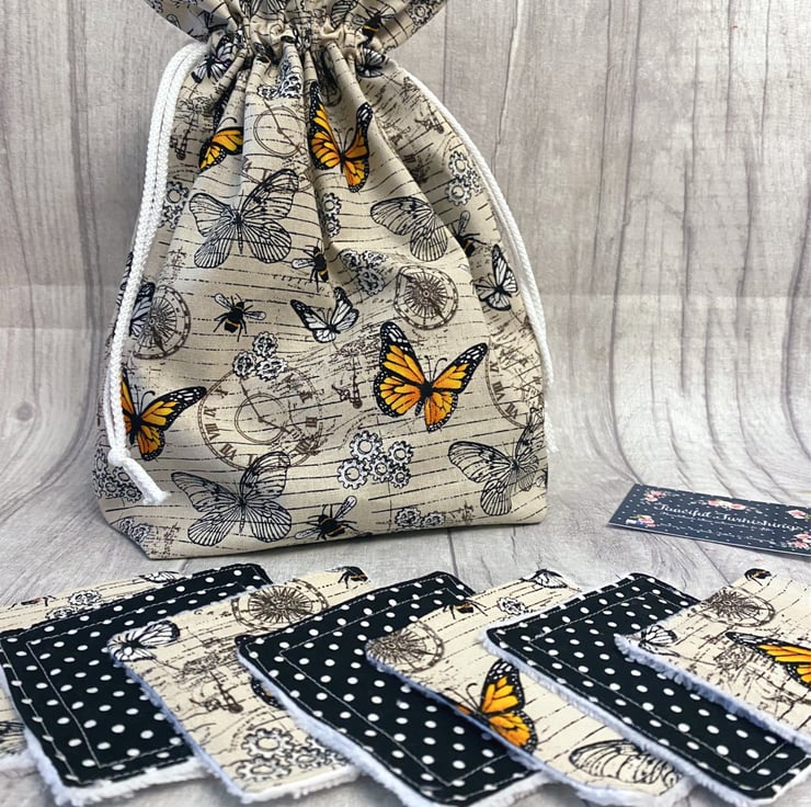 Reusable makeup wipes measure approximately 9.5cm x 9.5cm and come in a small organza bag. They can be machine washed on a 30 degree cycle. They’re created with eco friendly bamboo towelling which is beautifully soft.