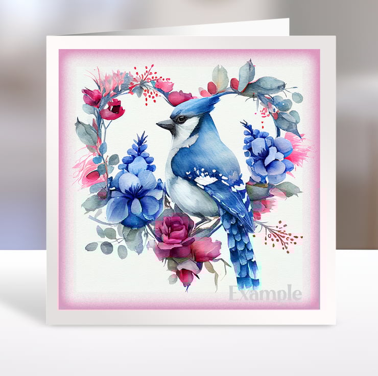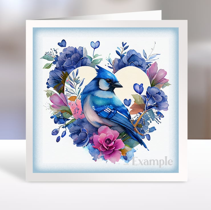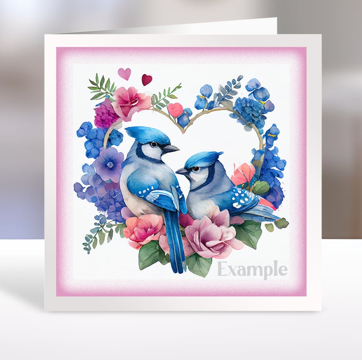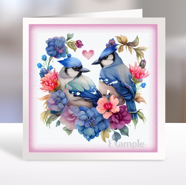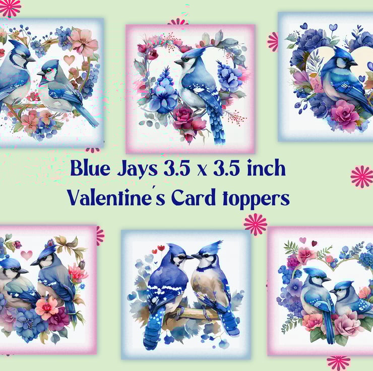 A set of six 3.5 inch square card toppers - Blue Jays - birds in heart shaped floral arrangements. Ideal for Valentine's day cards.