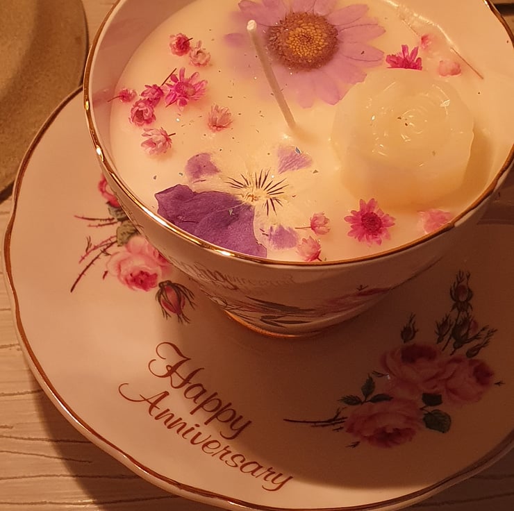 A stunning vintage tea cup Candle. With pretty flowers and Happy Anniversary on the tea cup and saucer. Made with 100% Soy Wax. Handmade Hand poured and decorated with Pressed flowers dried flowers and Wax flower. Scented with Lotus and Rose Fragrance Oil. One of a kind. Perfect for your own home or as a beautiful unique gift.