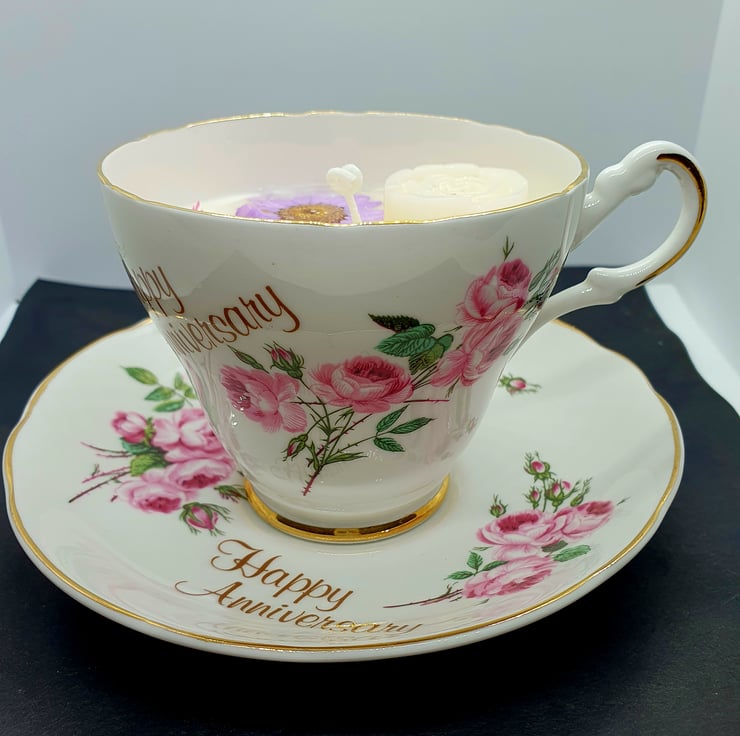 A stunning vintage tea cup Candle. With pretty flowers and Happy Anniversary on the tea cup and saucer. Made with 100% Soy Wax. Handmade Hand poured and decorated with Pressed flowers dried flowers and Wax flower. Scented with Lotus and Rose Fragrance Oil. One of a kind. Perfect for your own home or as a beautiful unique gift.