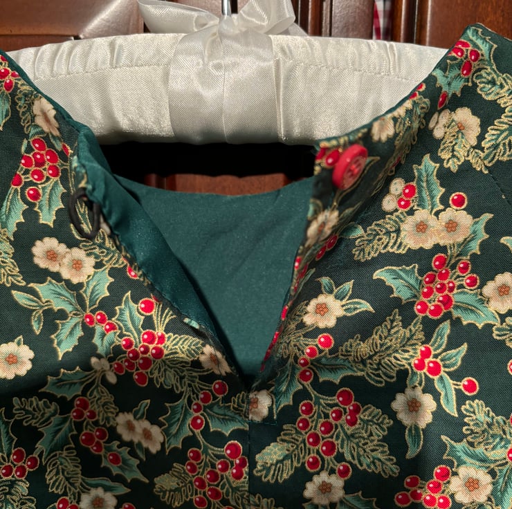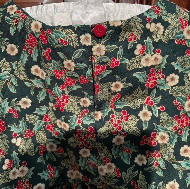 The dress is dark traditional Christmas green with gold metallic accents. The skirt is generously gathered onto a bodice, the bodice is fully lined including the sleeves.