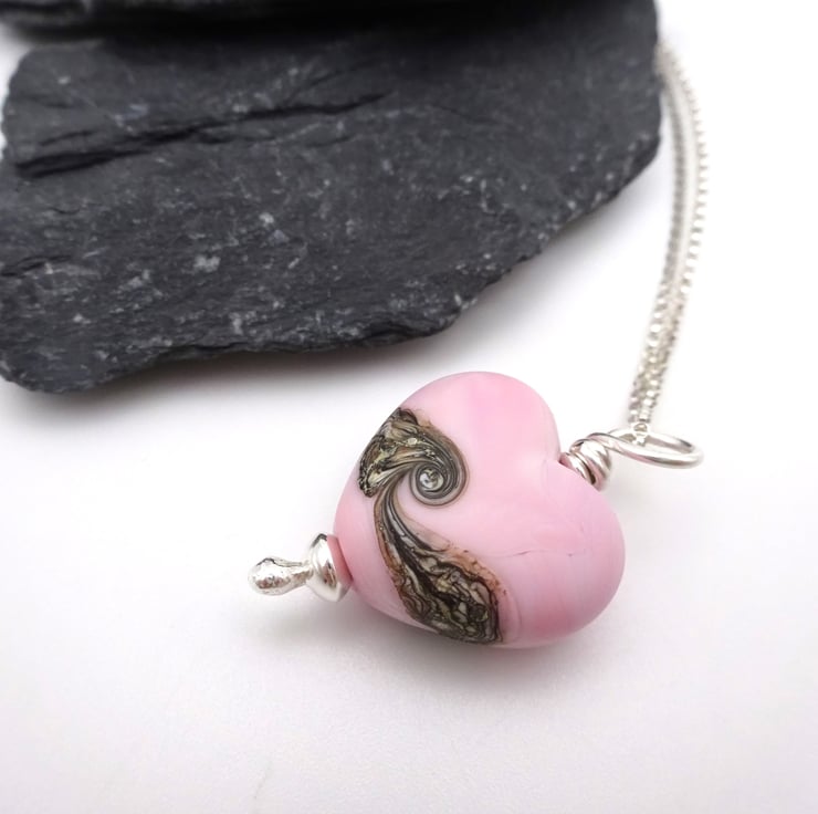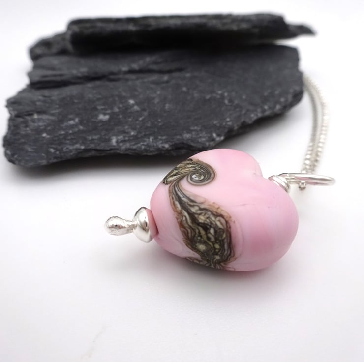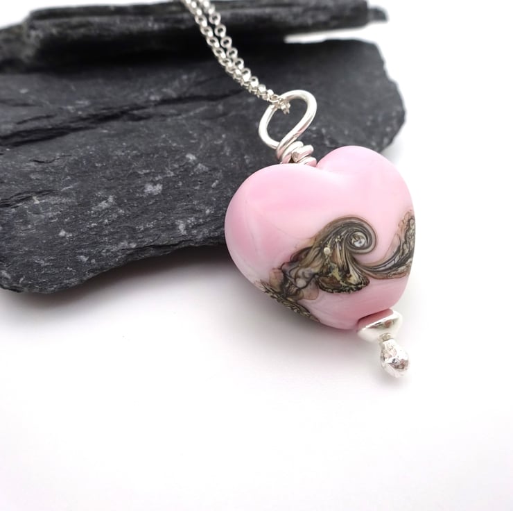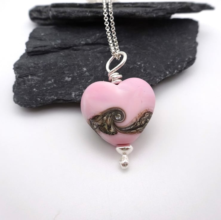 It features a sterling silver chain strung with a handmade lampwork glass pink heart pendant.