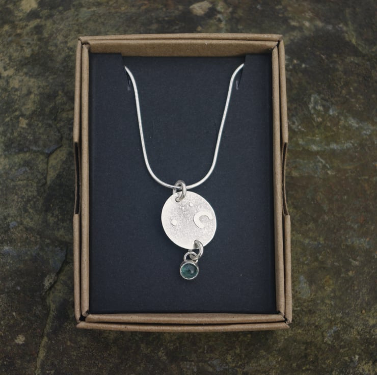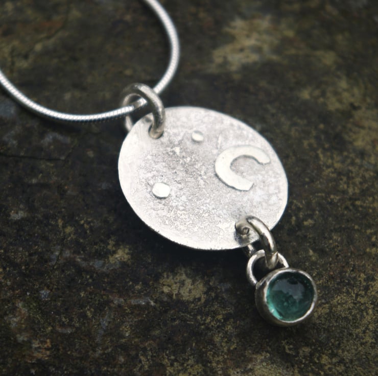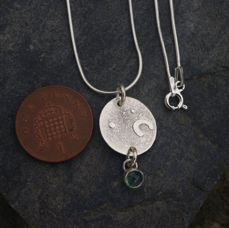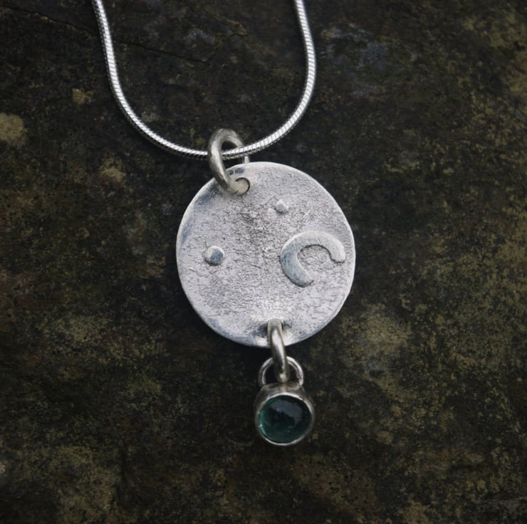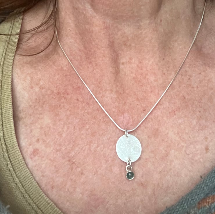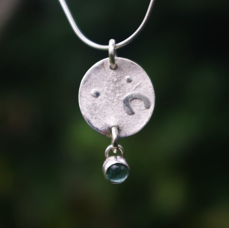 A textured, sterling silver pendant, inspired by natural textures, with a beautiful aqua coloured Tourmaline gemstone. This dangles from the bottom edge and has a diameter of 4.5mm. The texture has been fused onto the circular pendant All silver is from an eco source along with my left over bits to make the texture. This would make a perfect October Birthday present as Tourmaline is the birthstone of October.