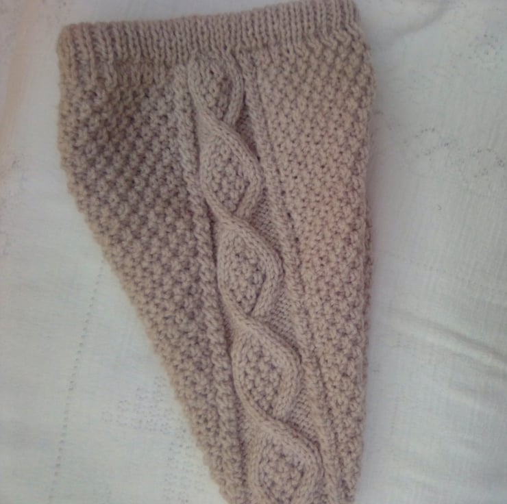 4 Piece suit for baby with a lovely moss stitch and cable pattern, including hooded jacket, trousers, bootees and mittens, hand knitted in aran weight Yarn for that extra warmth for your little one. It would make an ideal gift for a baby shower, new baby or a Christening.