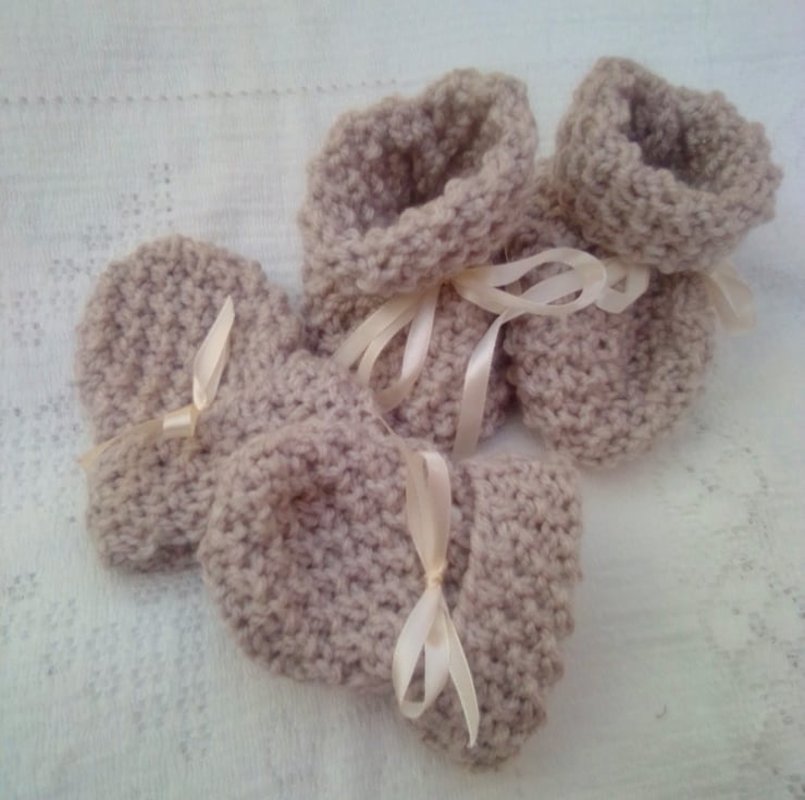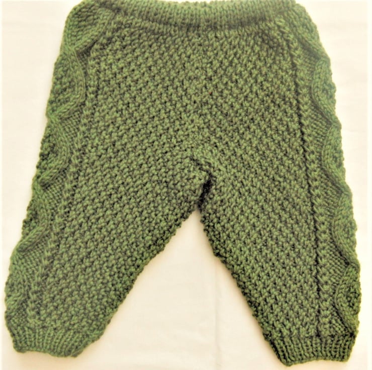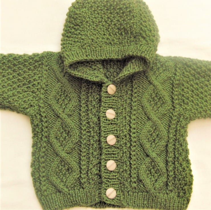 4 Piece suit for baby with a lovely moss stitch and cable pattern, including hooded jacket, trousers, bootees and mittens, hand knitted in aran weight Yarn for that extra warmth for your little one. It would make an ideal gift for a baby shower, new baby or a Christening.