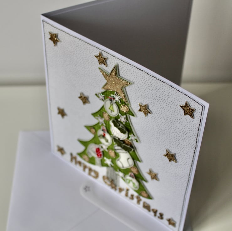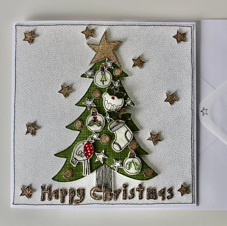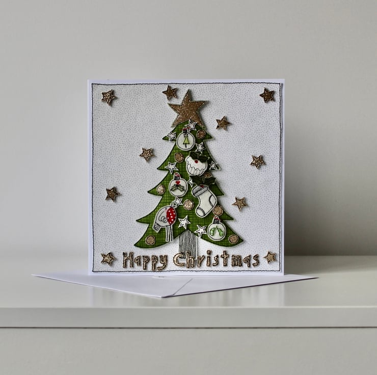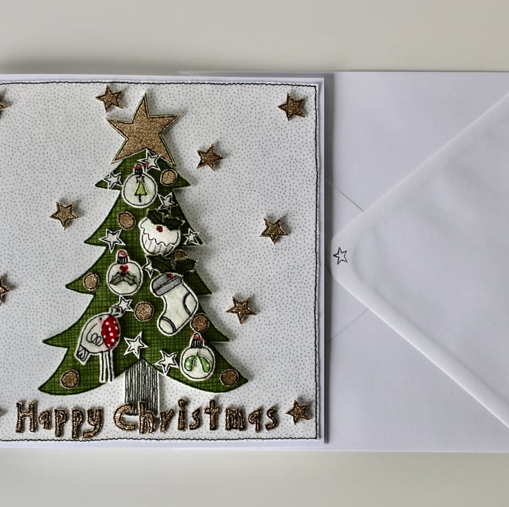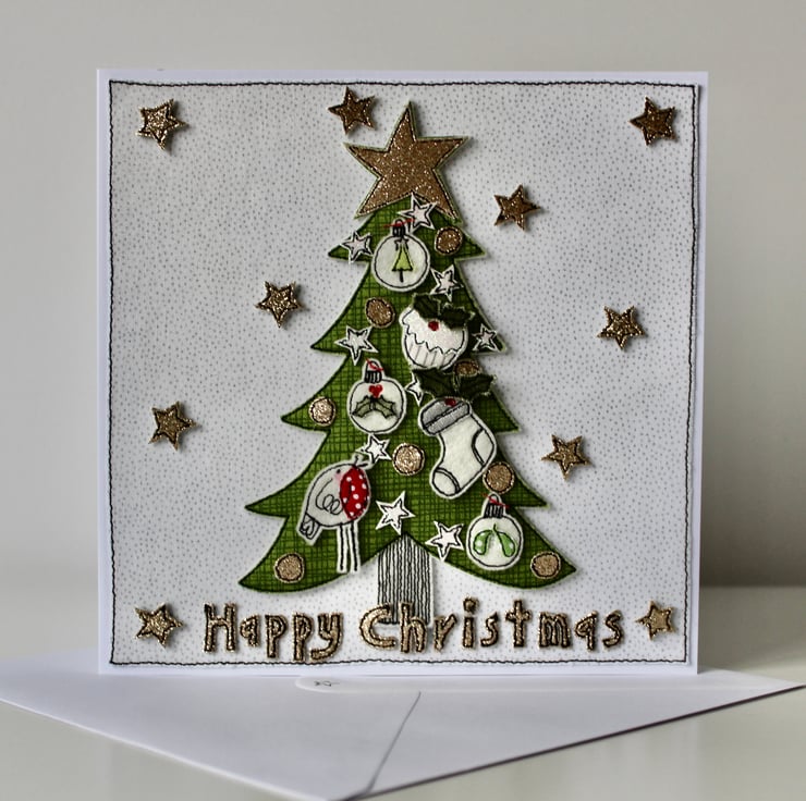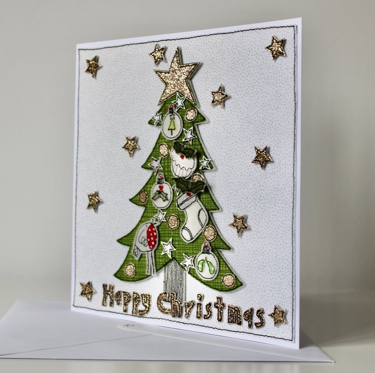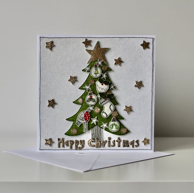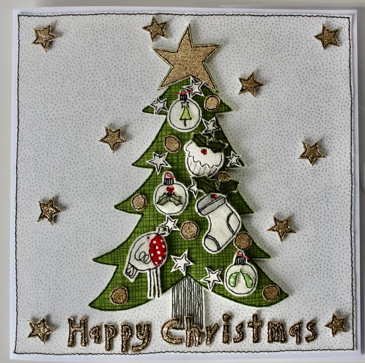 A handmade card which includes a decorated Christmas tree, surrounded by stars. With the sewn glitter words 'Happy Christmas'.