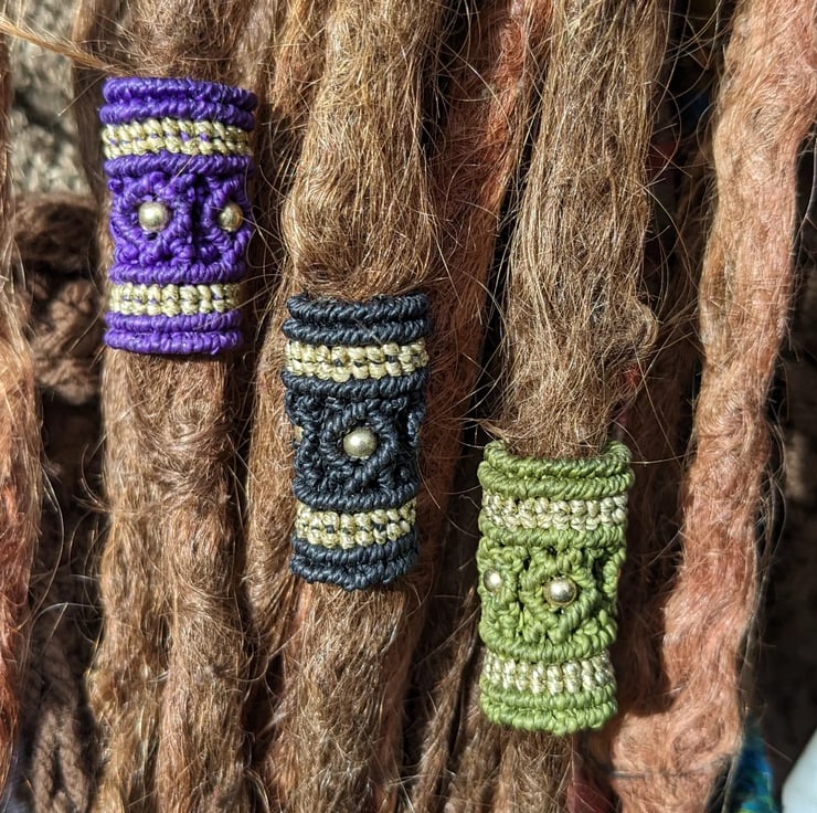 I first started making dread beads when I met my friend Kim last year. I macrame and she crochets and we kept making little gifts for eachother. She has dreads so these were the perfect little gift. She was also great to model them on! A red bead was requested by another friend so these are now being made too.