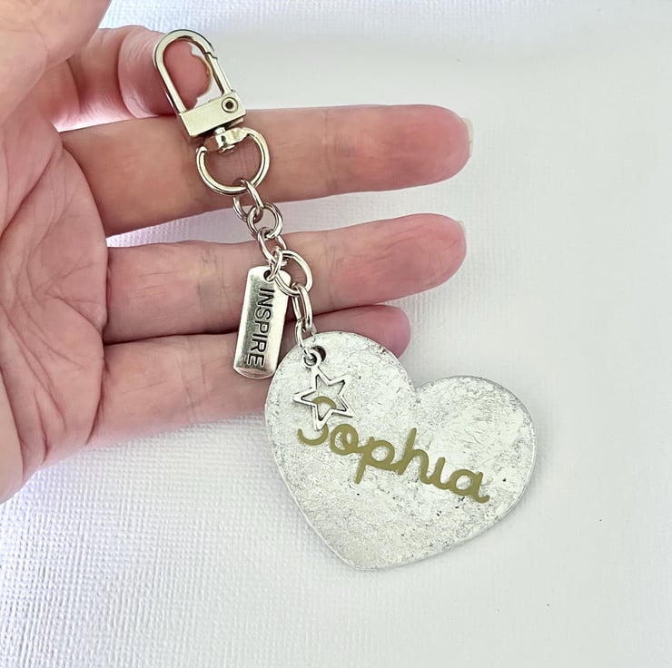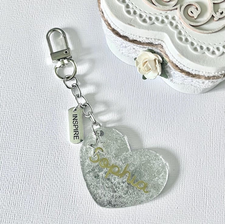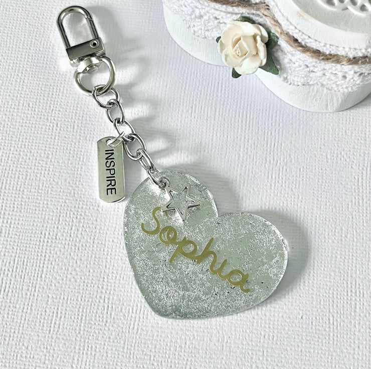 A acrylic heart with a silver background and name in Matt gold with a star and quote charm..