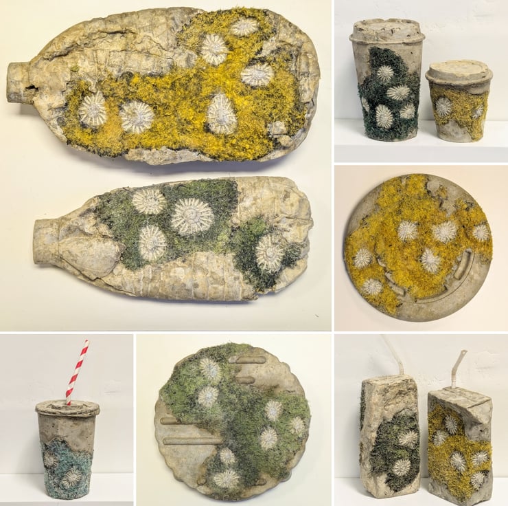 My work investigates change over time, not just eroding or decaying but new layers of growth, giving juxtapositions of structure and colour. Recent work highlights the issue of plastic pollution and the permanence of disposables through sculptures that combine embellished textiles and cement cast in plastic waste, inviting us to consider the packaging that we use and discard on a daily basis; objects that are so lightweight and seem so insignificant that we barely notice them. Naturally inspired textures emphasise the way our waste becomes subsumed into the natural world around us.