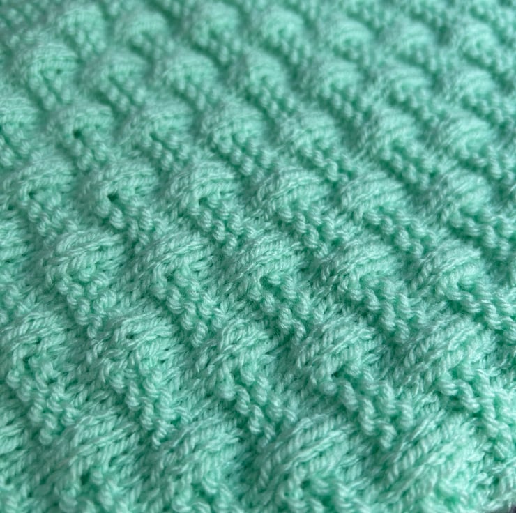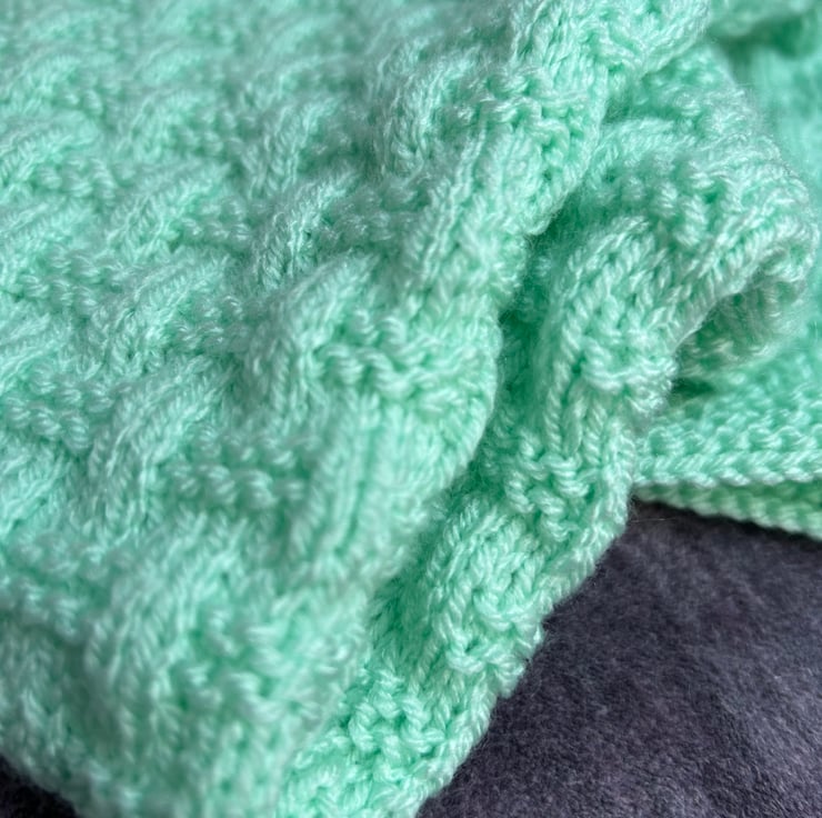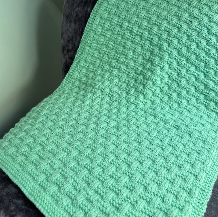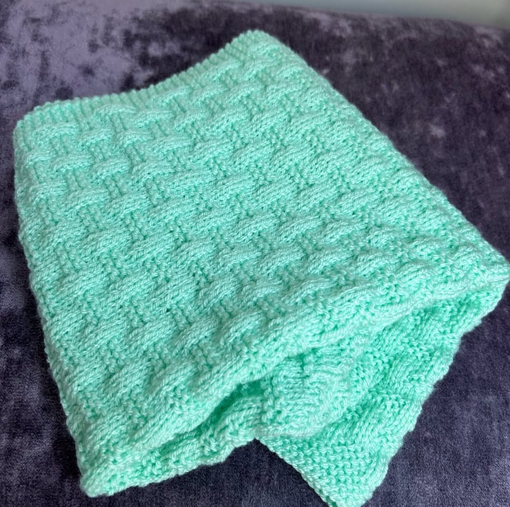 Small baby blanket, hand knitted in a mint green basket weave pattern.
