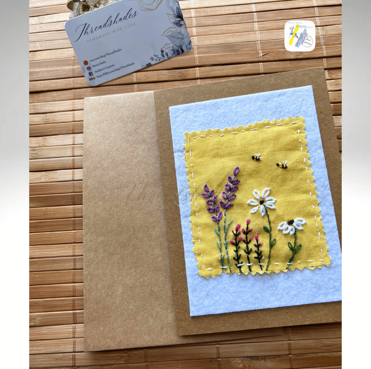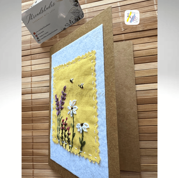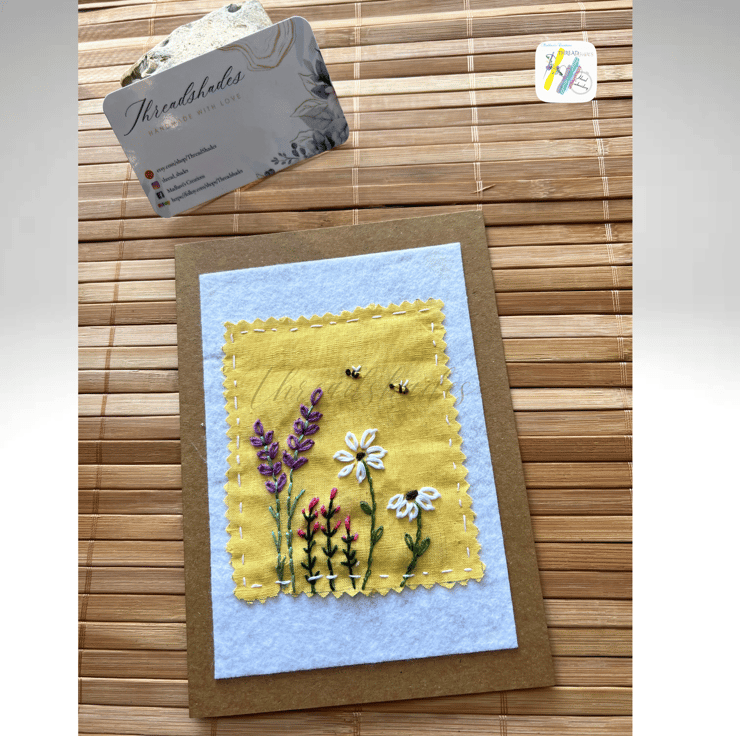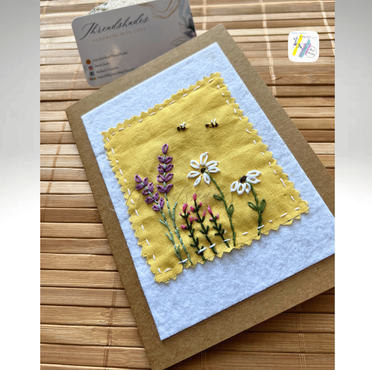 Product:- Handmade, Hand embroidered floral design greeting card